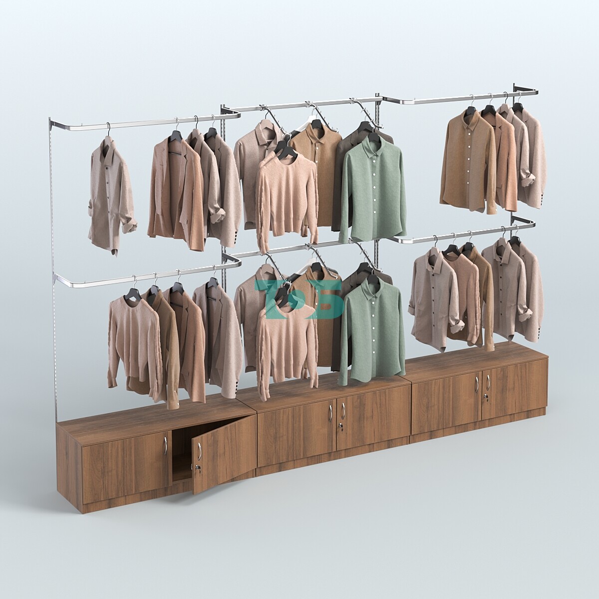 Настенная система для торговли одеждой METAL с задней стенкой шириной 3000 мм с пристенными поручнями и четырьмя полками из ДСП №9