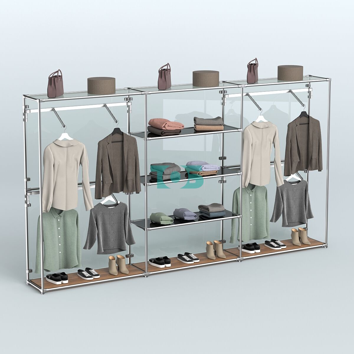 Настенная система для торговли одеждой METAL без задней стенки шириной 3000 мм с поручнями и прозрачными полками №6