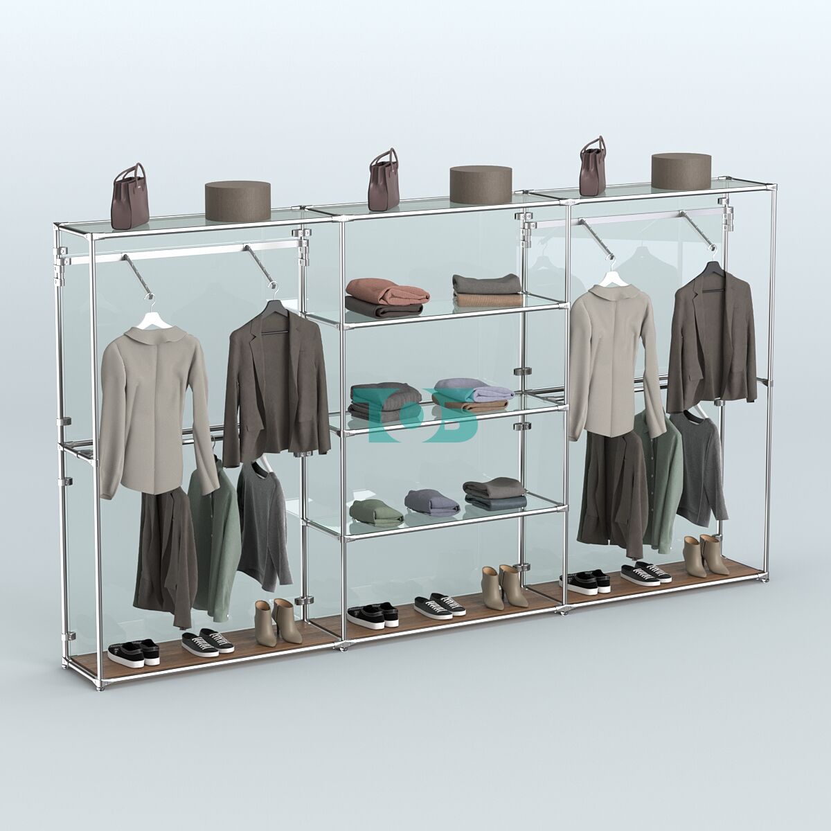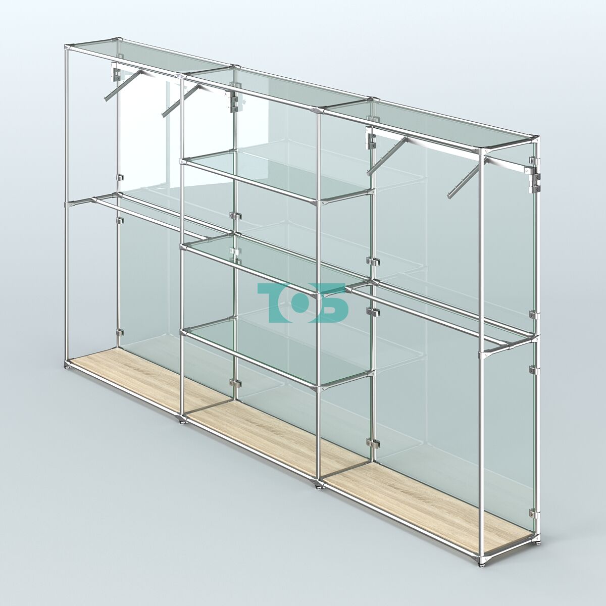 Отличия модели торговой системы ХРОМ (задняя стенка - стекло) 3600 мм с прозрачными полками и поручнями №10:
