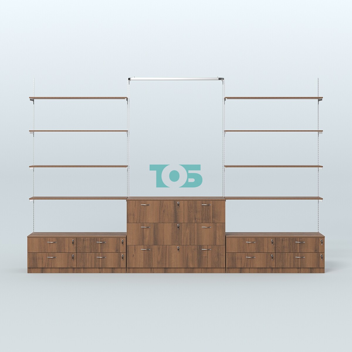 Настенная система для торговли одеждой METAL с задней стенкой шириной 3000 мм с П-образными поручнями и тонированными полками №7