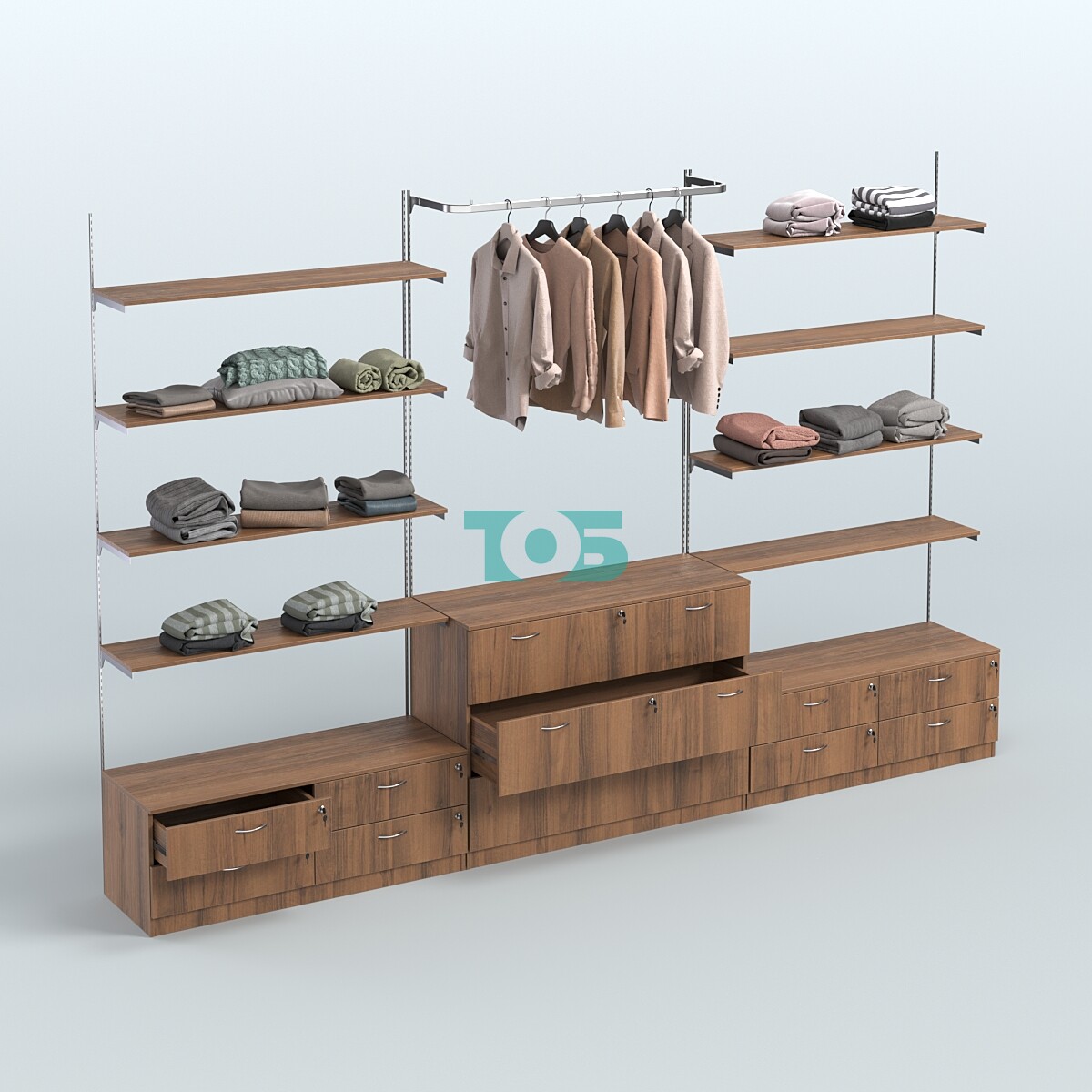Настенная система для торговли одеждой METAL с задней стенкой, пристенным поручнем и тонированными полками шириной 1000 мм №10