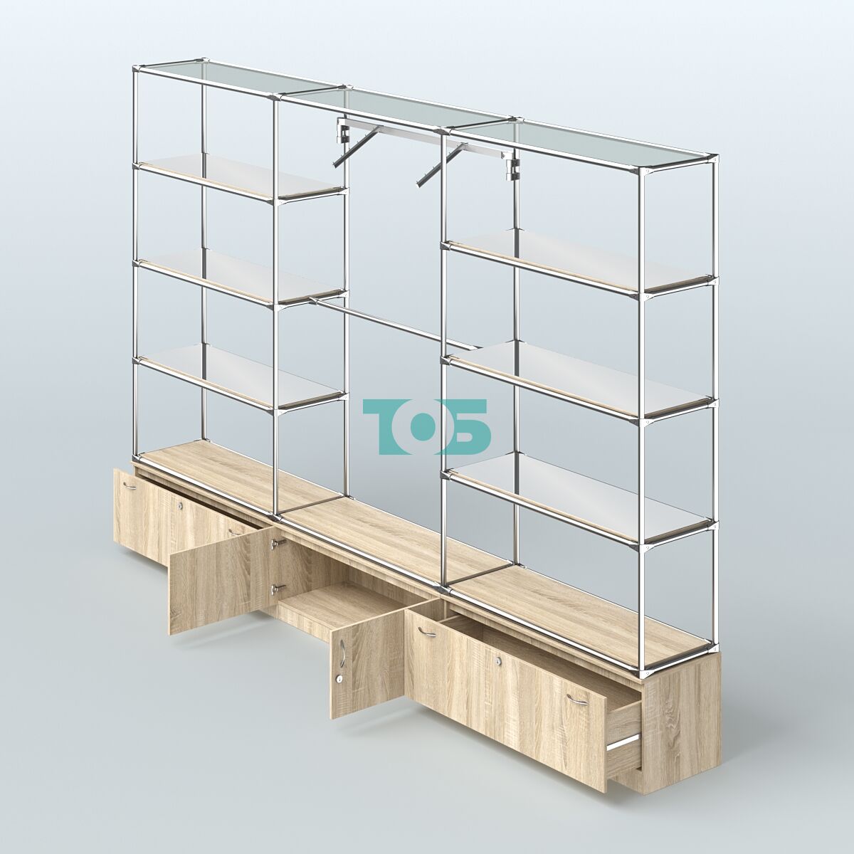 Высокая островная система METAL-2400 без задней стенки для одежды с пристенными поручнями и полками из прозрачного стекла №9