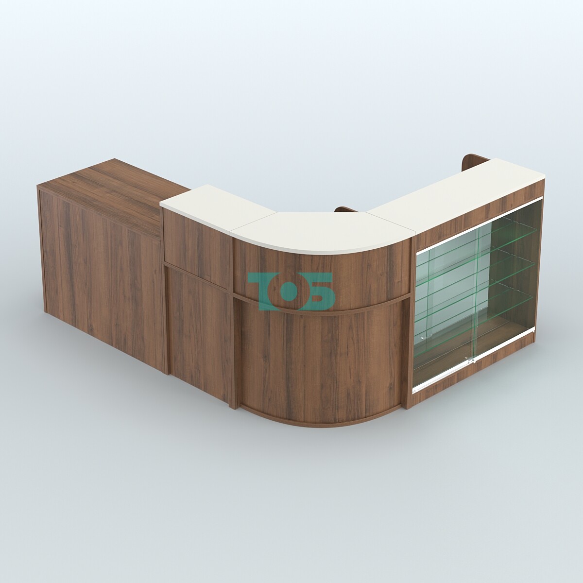 - фасад прямоугольного ресепшена представляет из себя витрину с тремя стеклянными полками и зеркальной задней стенкой. Верхний фриз витрины укомплектован тремя светильниками, которые освещают Товар на полках. Лицевая часть витрины защищена раздвижными стеклянными шторками на мини роликовых направляющих (аналог шкафа-купе) и закрывается на врезной замок. Со стороны продавца предусмотрены два выдвижных ящика с замком и ниша с полкой, куда удобно складировать коробки с товаром и пр;
