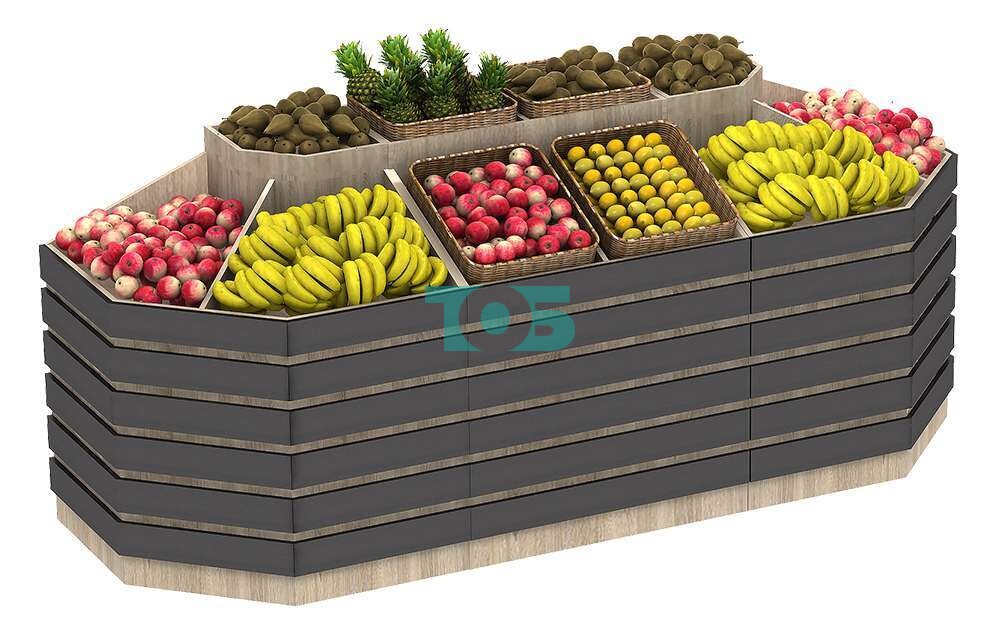 Пристенный овощной развал FRUIT-COURT №4 — это многофункциональное решение для демонстрации и продажи различных товаров, включая продукты длительного хранения, овощи, фрукты и многое другое.
