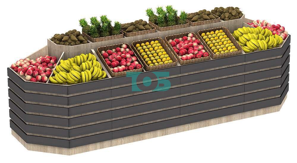 Пристенный овощной развал FRUIT-COURT №5 — это практичное и стильное решение для демонстрации и продажи разнообразных продуктов, включая овощи, фрукты и товары на развес.