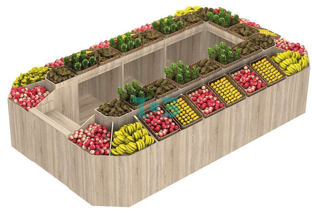 Торговый островок-павильон FRUIT-COURT №3 — это универсальное решение для демонстрации и продажи различных товаров, включая овощи, фрукты и продукты длительного хранения.