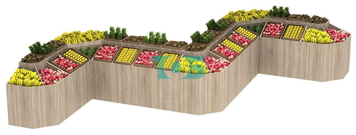 Угловой овощной развал FRUIT-COURT №4 обеспечивает эффективное использование торгового пространства и удобство при выкладке товаров, что делает его отличным выбором для магазинов и рынков.