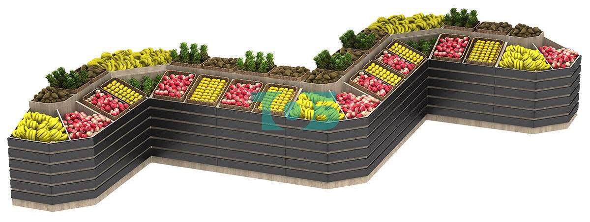 Угловой овощной развал с декором FRUIT-COURT №8 — это функциональное и стильное решение для демонстрации и продажи различных товаров, включая продукты длительного хранения, овощи, фрукты и многое другое.