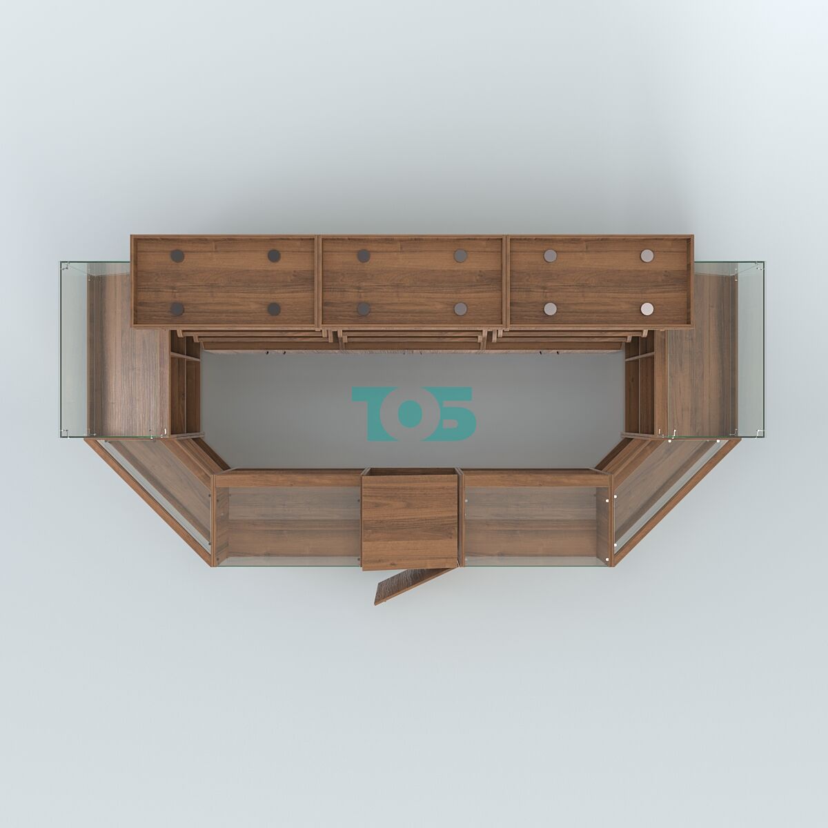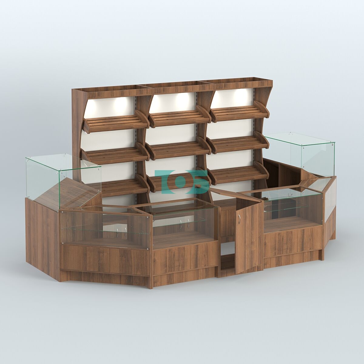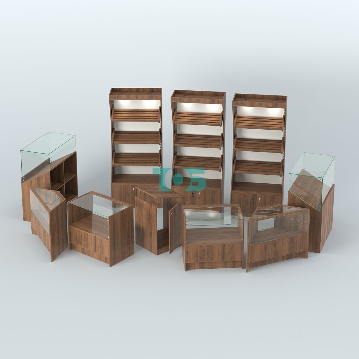 - включает три стеллажа с тремя наклонными полками для хлеба, два прилавка под хлеб с наклонной полкой для выкладки хлеба, два угловых и два прямоугольных прилавка со стеклянным фасадом и полкой и входной прилавок с откидной крышкой;