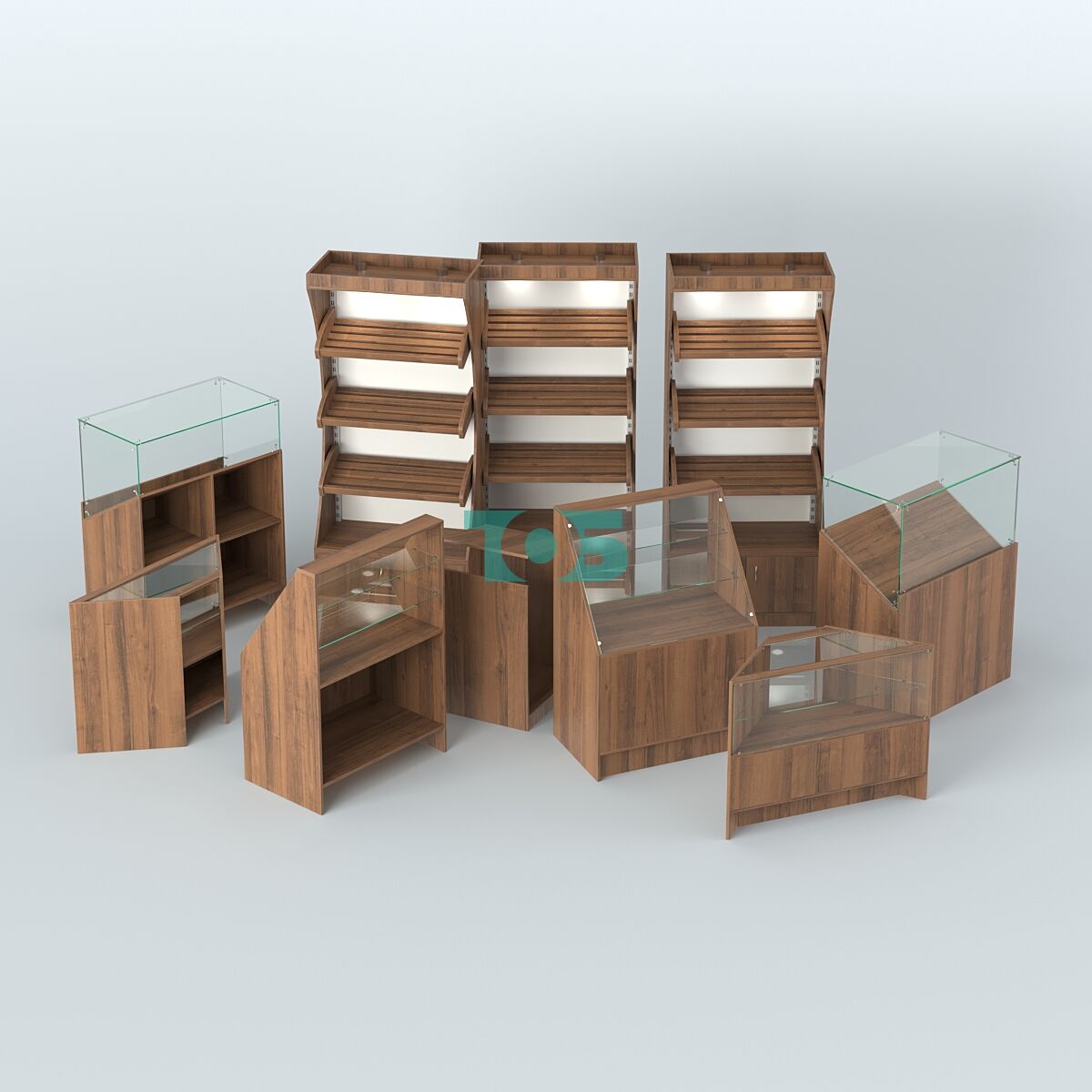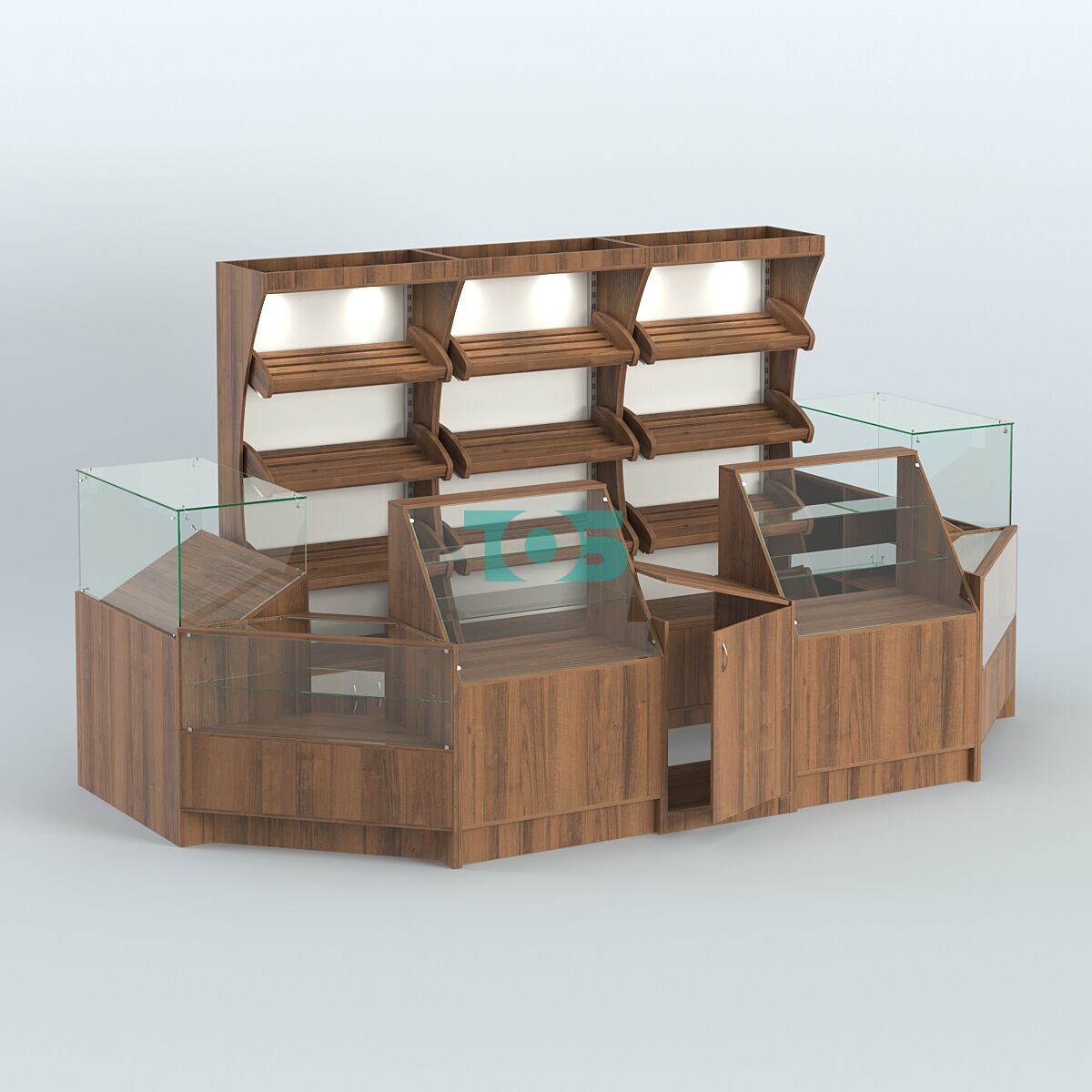 - включает три стеллажа с тремя наклонными полками для хлеба, два прилавка под хлеб с наклонной полкой для выкладки хлеба, два угловых прилавка со стеклянным фасадом и полкой, два прилавка с наклонным стеклянным фасадом и входной прилавок с откидной крышкой;