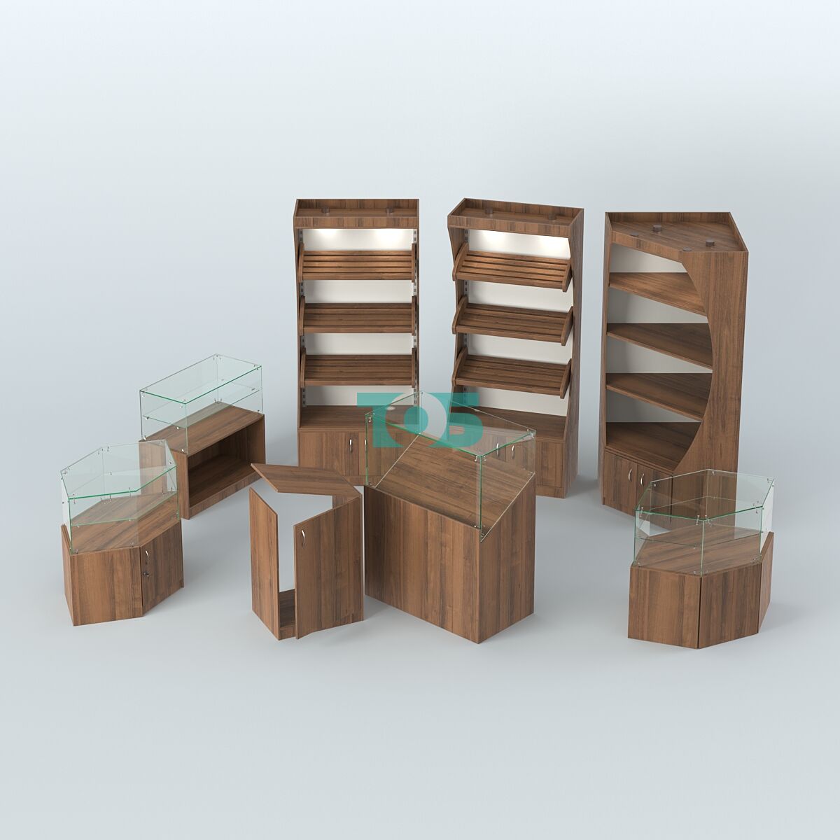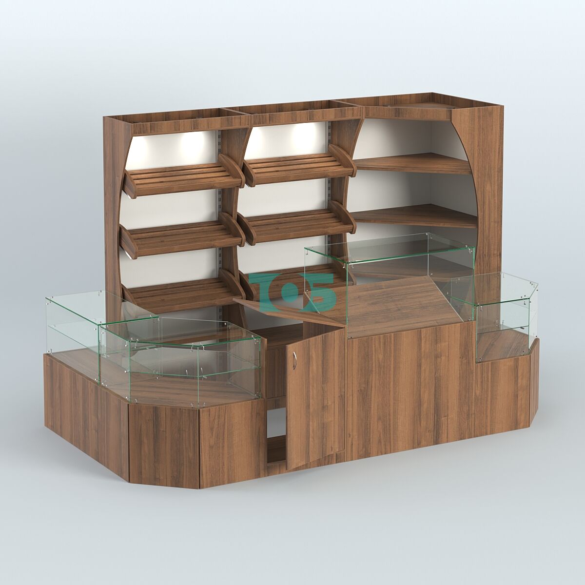 - включает два стеллажа с тремя наклонными полками для хлеба, высокий угловой стеллаж с полками, один прилавок под хлеб с наклонной полкой для выкладки, два угловых прилавка и один прямоугольный со стеклянным верхом и полкой, а также входной прилавок с откидной крышкой;