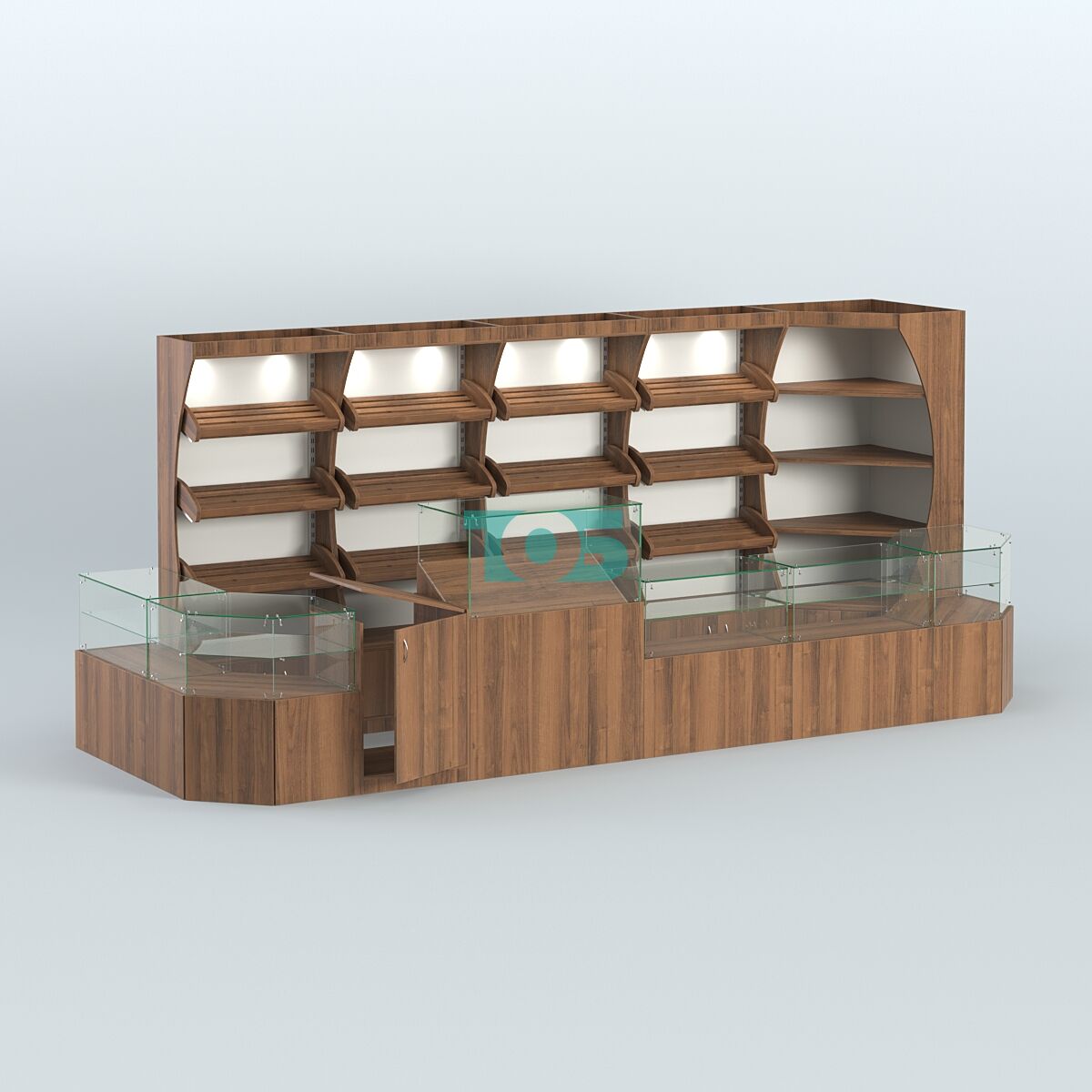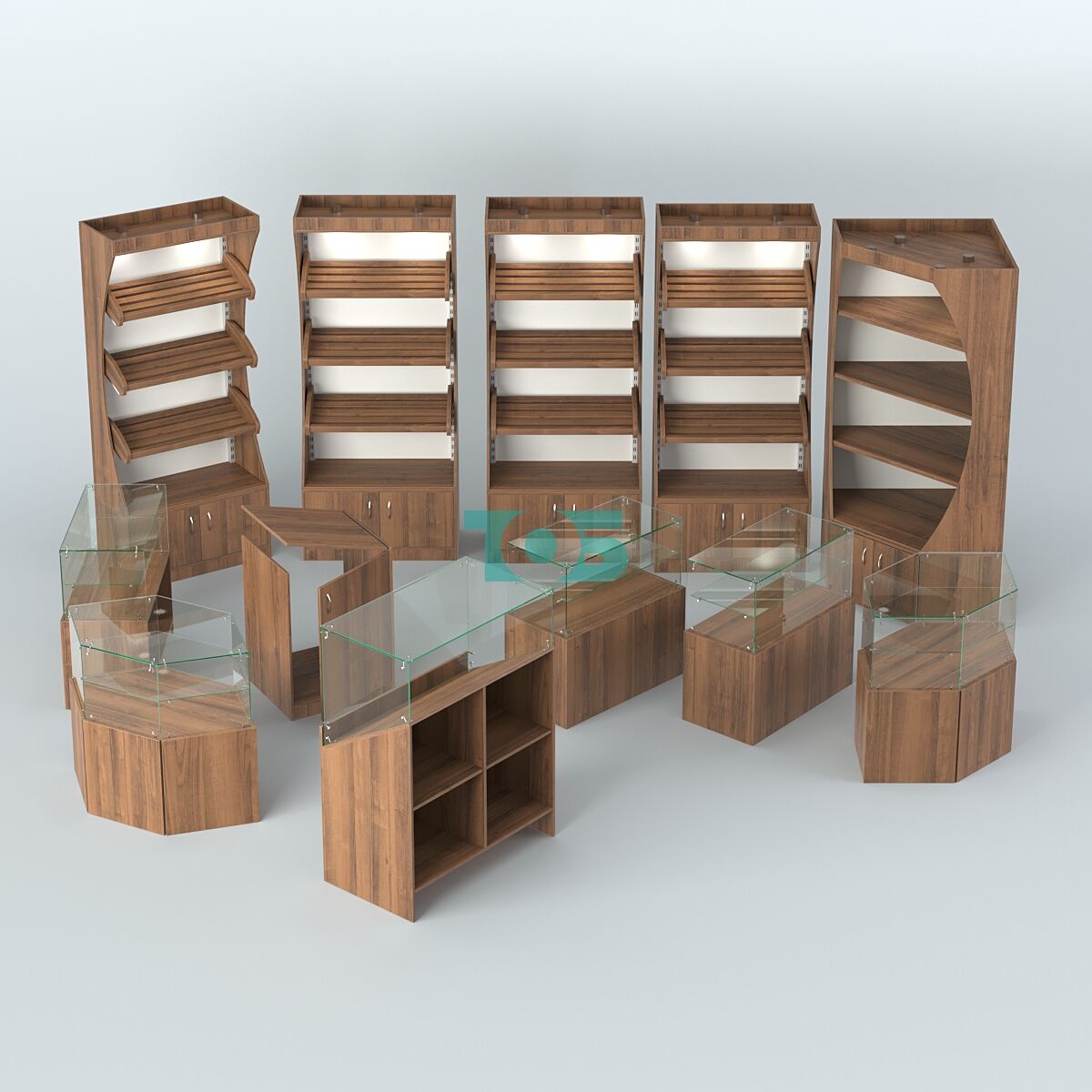 - включает четыре стеллажа с тремя наклонными полками для хлеба, высокий угловой стеллаж с полками, один прилавок под хлеб с наклонной полкой для выкладки, два угловых прилавка и три прямоугольных со стеклянным верхом и полкой, а также входной прилавок с откидной крышкой;