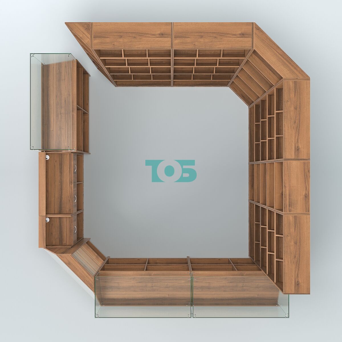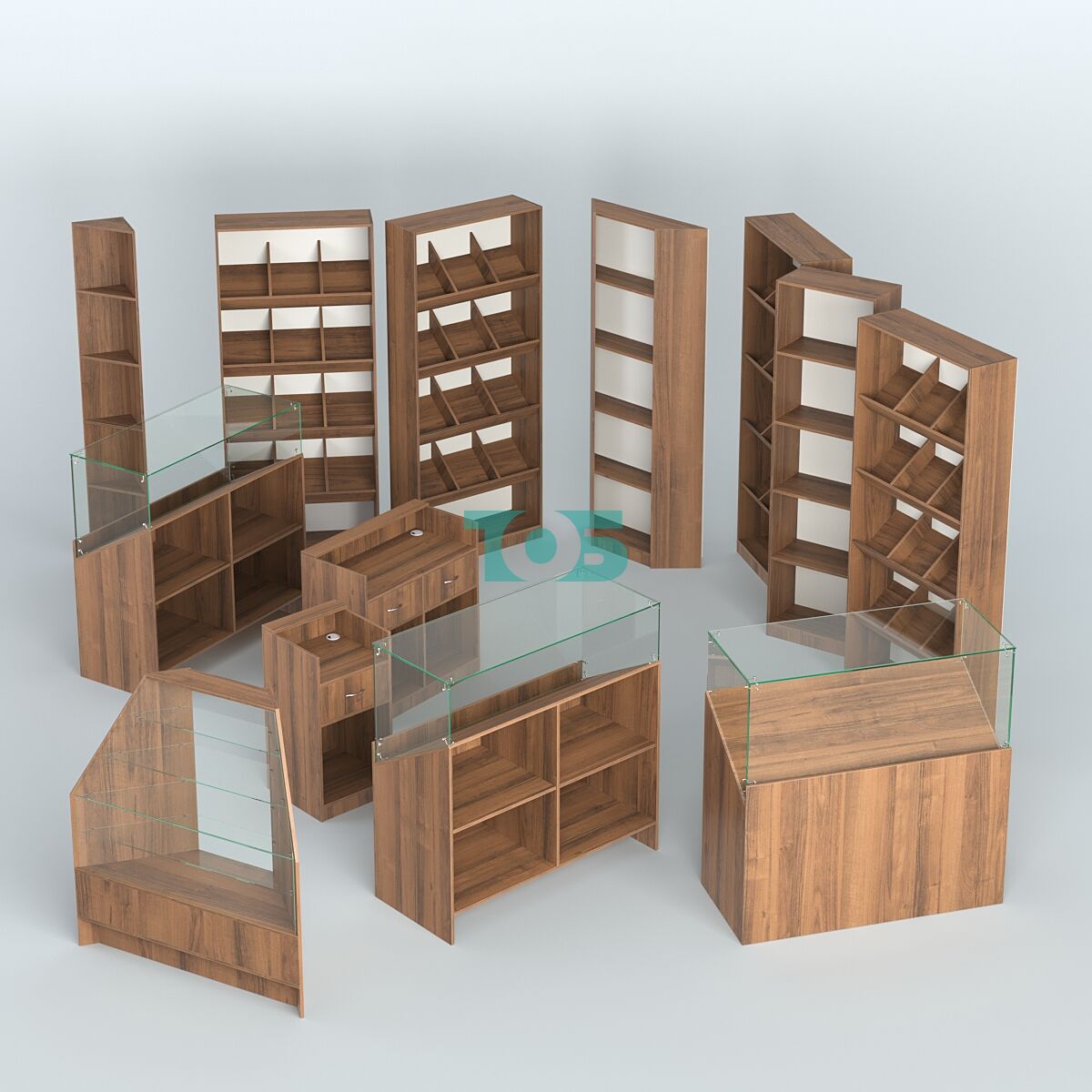 - включает четыре стеллажа с наклонными полками, один узкий и два угловых стеллажа (внешний и внутренний угол) с прямыми полками, три широких прилавка под хлеб с наклонной полкой для выкладки, один угловой прилавок со стеклянным фасадом, прилавок под кассу и прилавок на колесах;