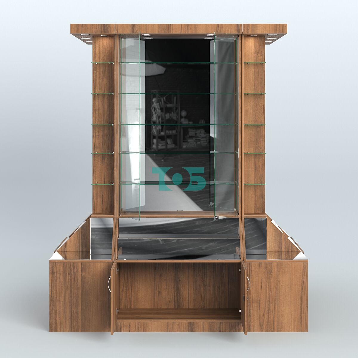 - Витрины оборудованы верхним фризом с подсветкой, зеркальной задней стенкой, запирающимися на ключ дверцами.