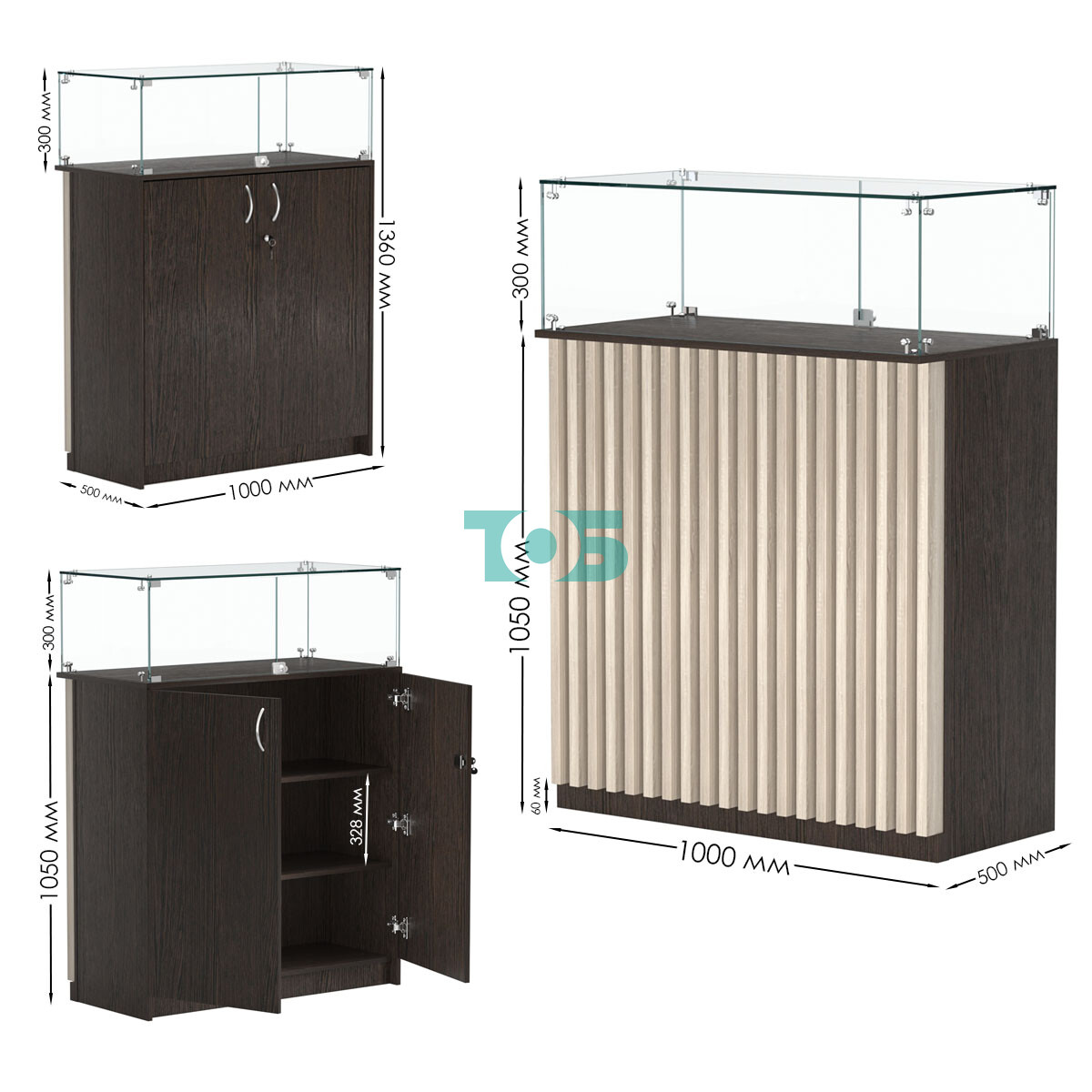 • Торговый прилавок прямоугольный с планками и стеклянным колпаком ВЕРТИКАЛЬ №1, Дуб Венге и Дуб Сонома