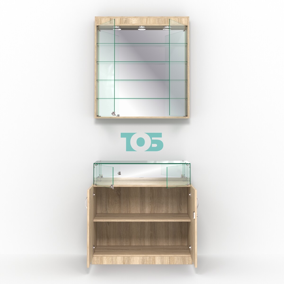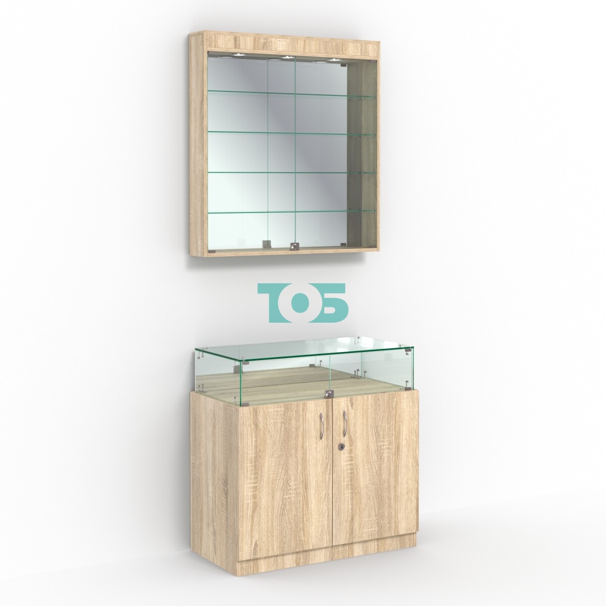 - комплект включает настенную витрину и прилавок со стеклянным верхом;