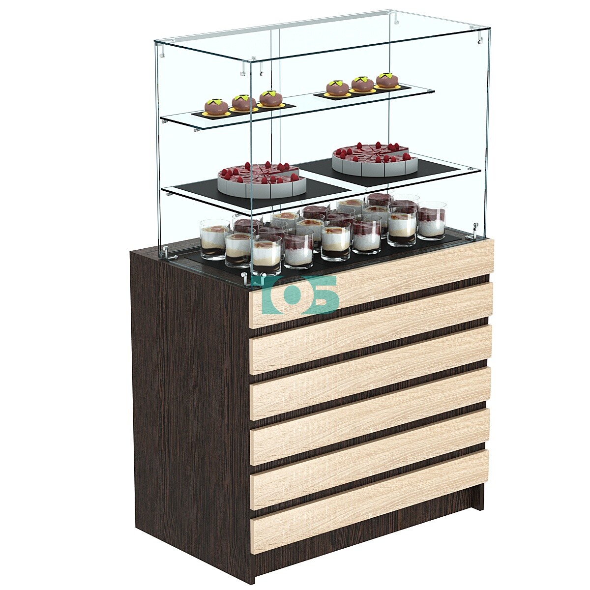 Торговый прилавок с двумя стеклянными полками и фасадными панелями №1Э-02