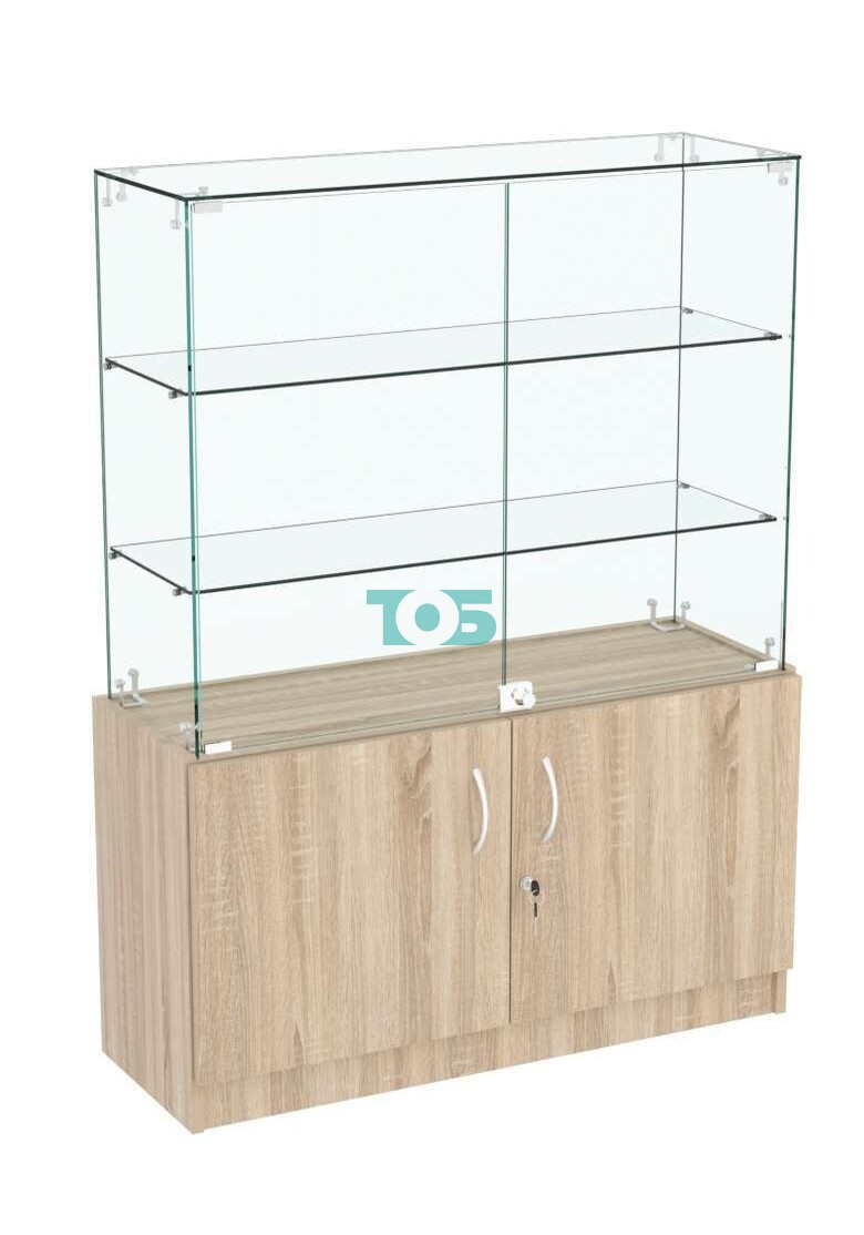 • Конструкция со стороны продавца: в верхней части расположены стеклянные дверки с замком, что позволяет безопасно хранить товары или документы. В накопителе предусмотрены двери из ДСП с замком, что также способствует организации безопасного хранения.