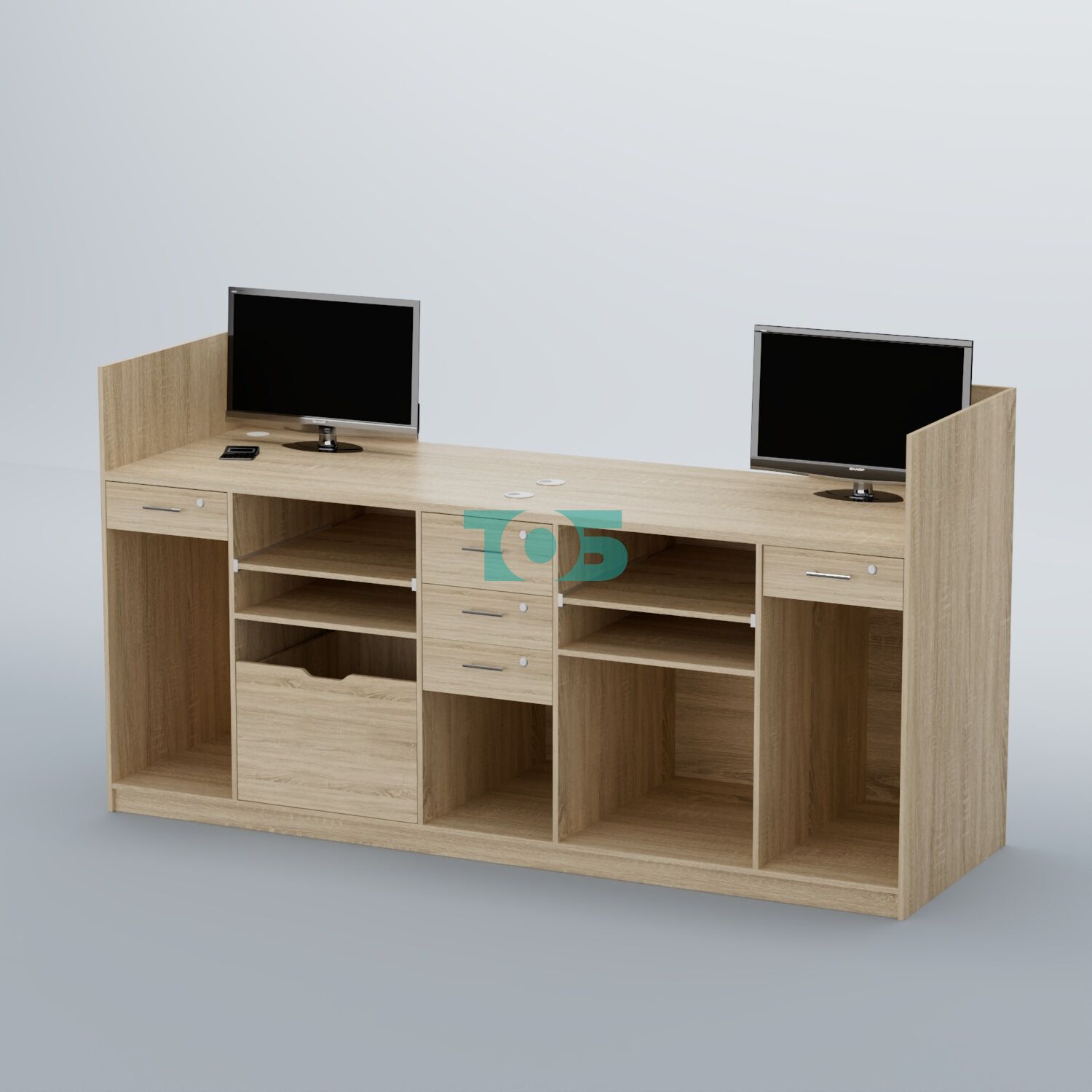 Правое и левое крыло ресепшена со стороны продавцов укомплектованы выдвижными ящиками с врезными замками и секциями под компьютерные блоки.