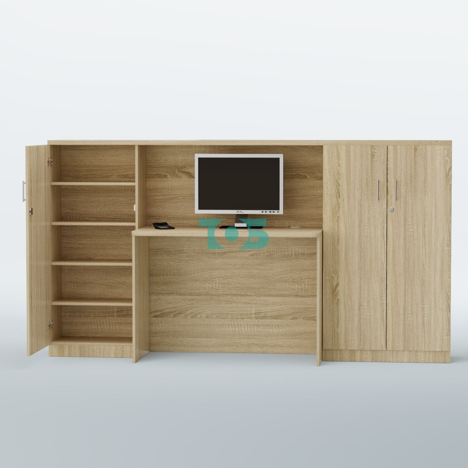 Организация пространства: наличие шкафов с полками позволяет удобно хранить различные предметы и документы, обеспечивая порядок и доступность.