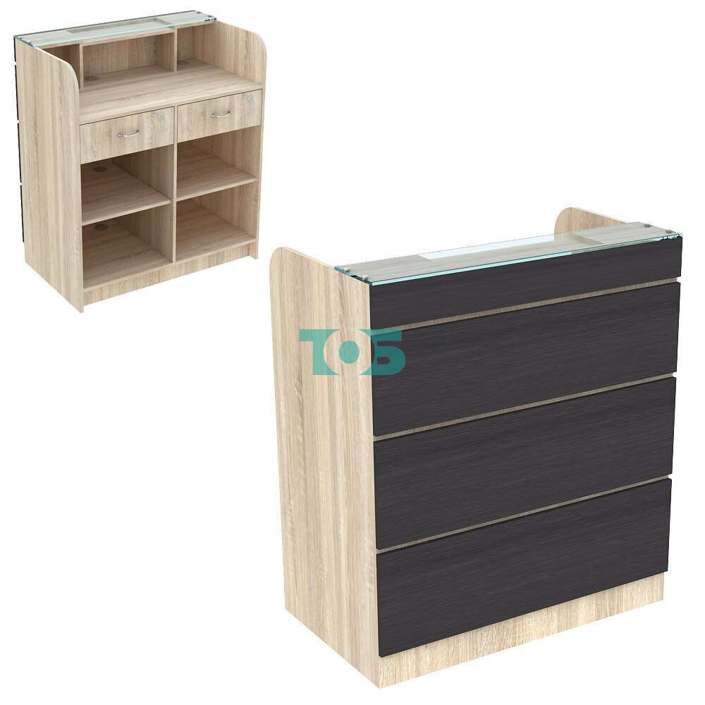 Со стороны продавца предусмотрены 2 выдвижных ящика с замками, расположенных под рабочим столом, и 2 ниши с полками для хранения коробок с товаром и других необходимых предметов.