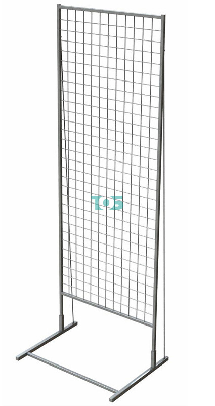 Сетчатый стенд - отдельностоящий сетчатый модуль, который установлен на специальной опоре. Сетка стенда имеет размер ячейки 50х50мм, на прут которой одевают различные навесные элементы: крючки, кронштейны, полки, корзины, в зависимости от специфики продаваемого товара.