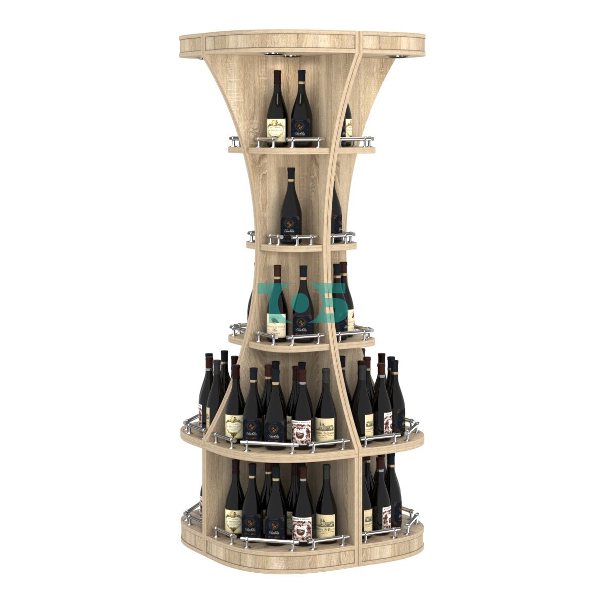 Конструкция: стеллаж образует высокий островок-колонну в центре торгового зала, что позволяет эффективно использовать пространство и привлечь внимание к алкогольной продукции.