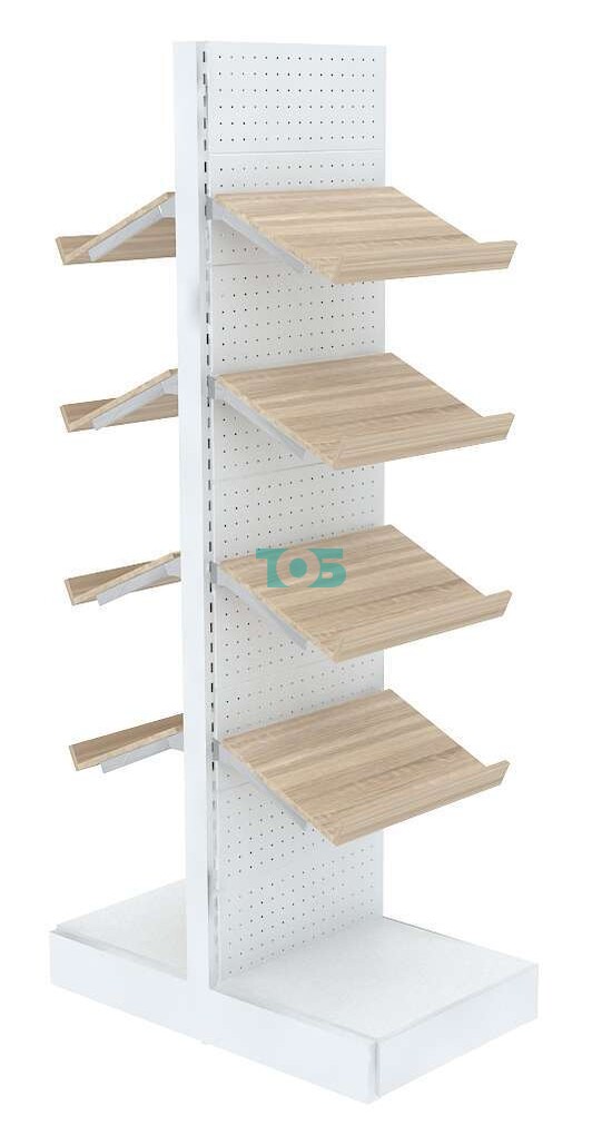 Низкий островной металлический торговый стеллаж со стеклянными полками и перфо- рированной задней стенкой