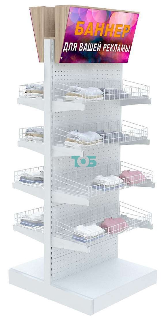 - стеллаж включает восемь металлических проволочных корзин белого цвета для демонстрации Товара покупателю;