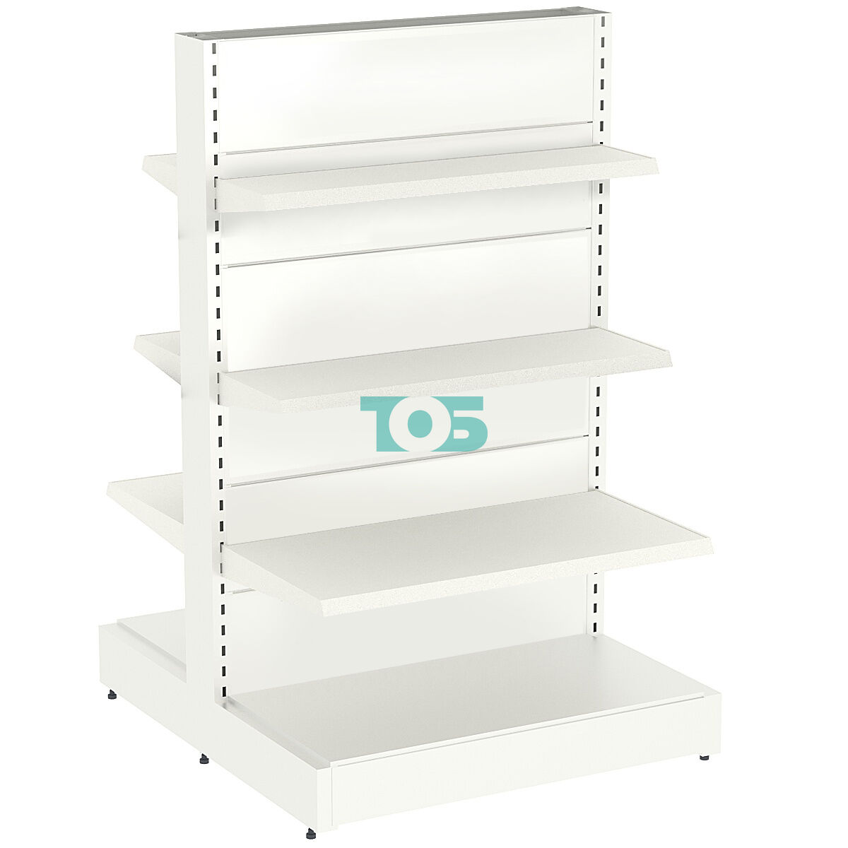 Тип стеллажа: островной. Полки расположены по обеим сторонам, что позволяет эффективно использовать пространство и обеспечивает удобный доступ к хранимым предметам с обеих сторон.