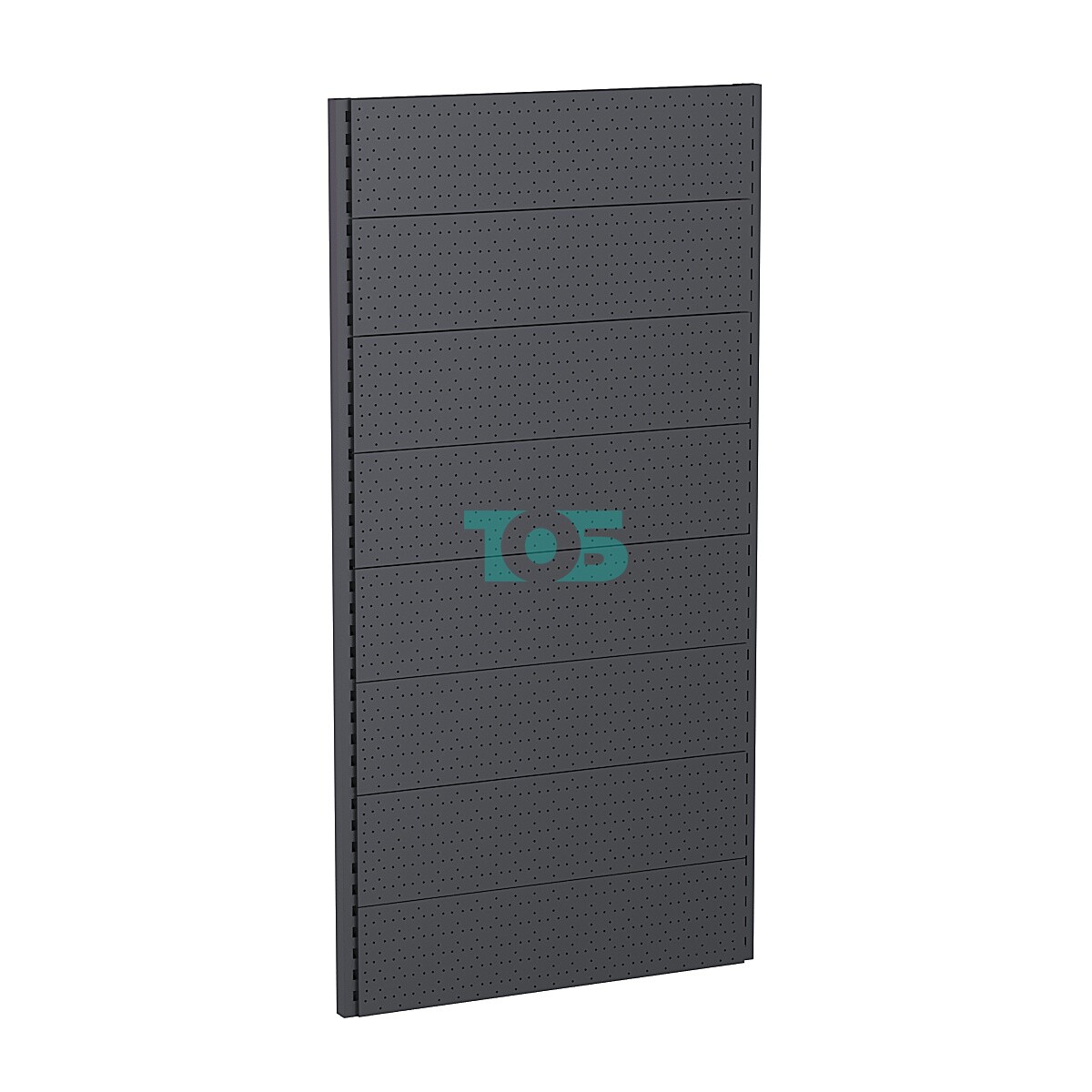 Задняя стенка стеллажа: выполнена из металлических перфорированных панелей. Есть возможность замены на гладкие металлические панели или сетку.