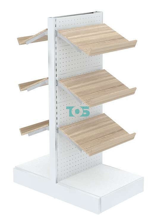 Отличия модели низкого узкого островного стеллажа с перфорацией и наклонными полками №6: