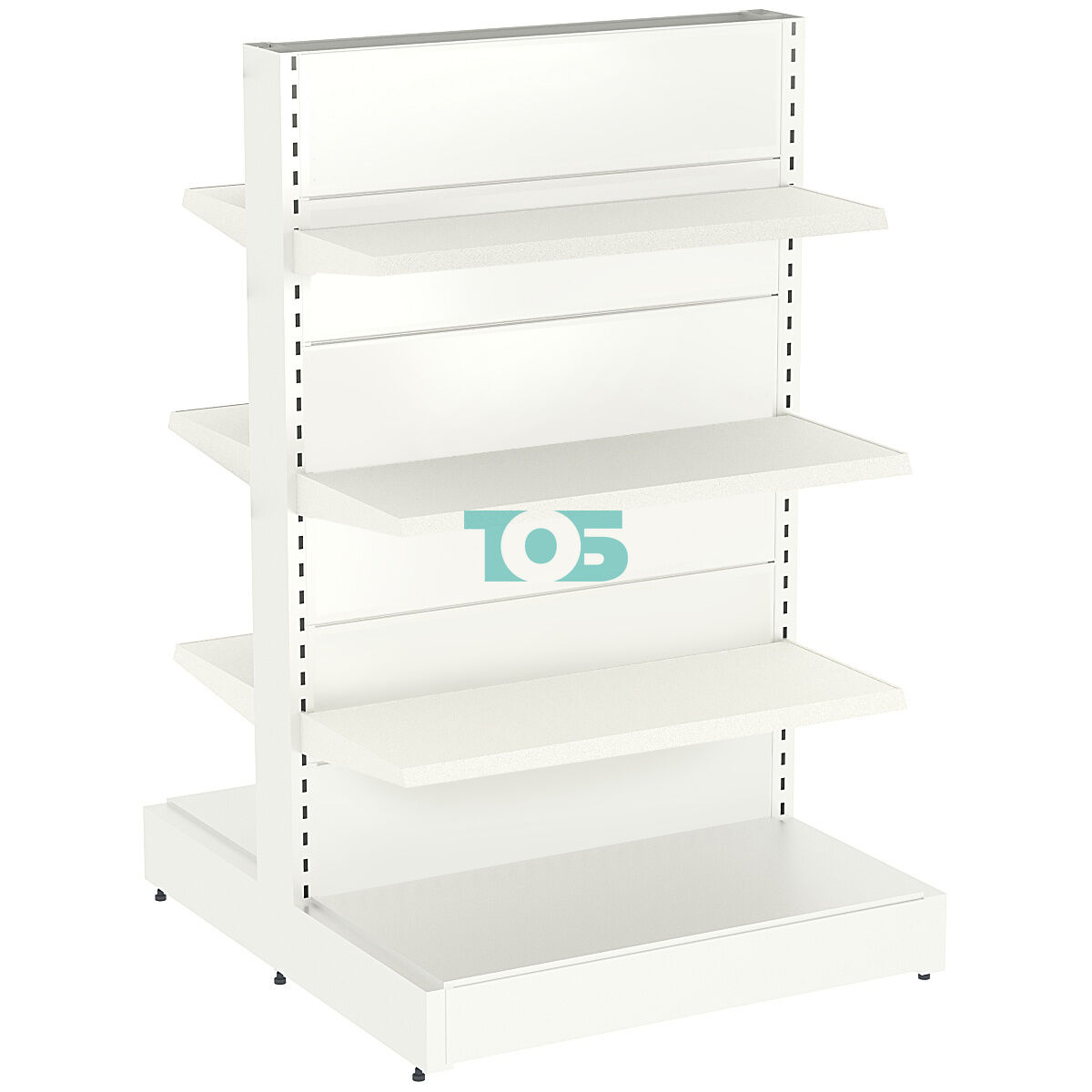 Тип стеллажа: островной. Полки расположены по обеим сторонам, что позволяет использовать стеллаж для хранения предметов с двух сторон.