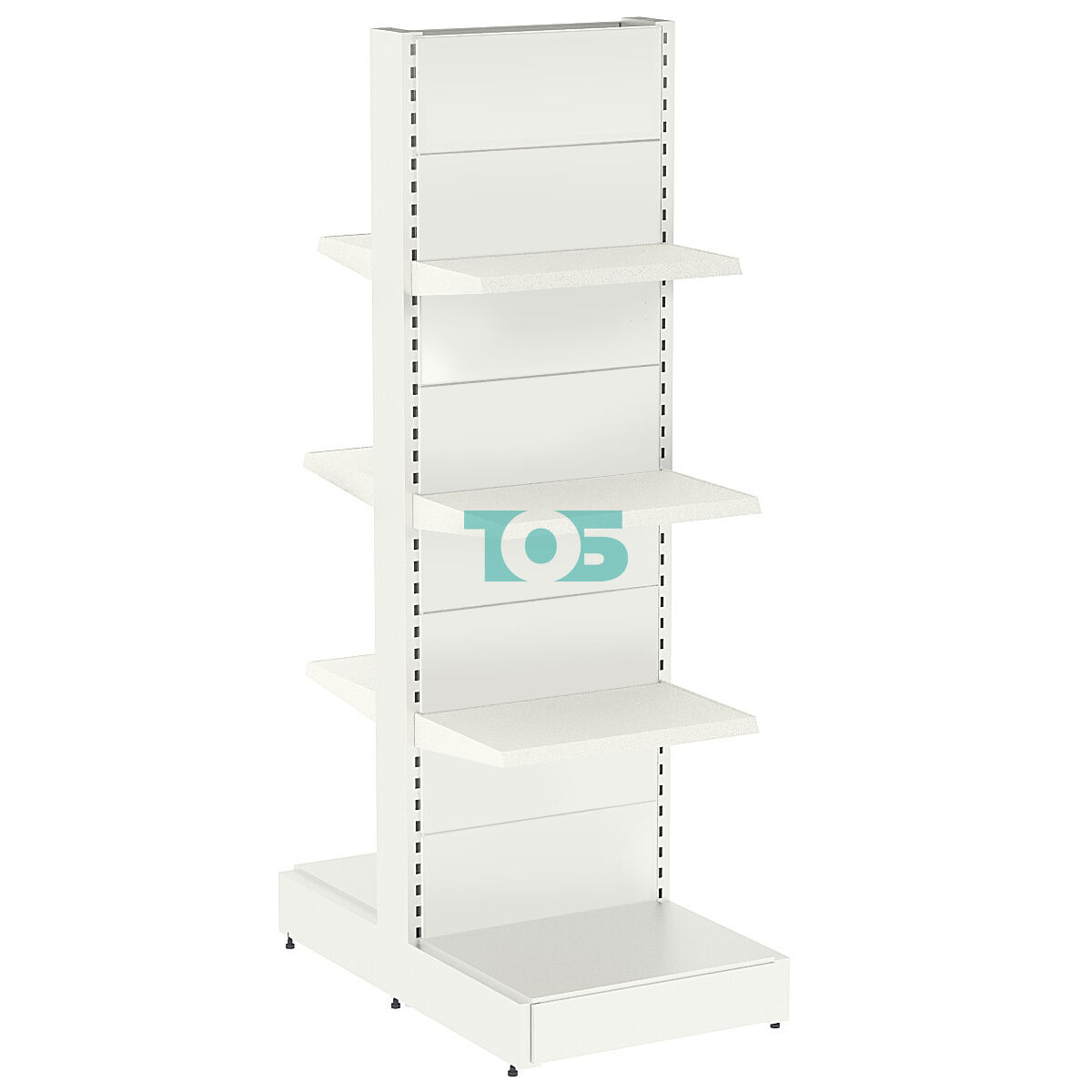 Высокий островной металлический торговый стеллаж с полками из ДСП и перфо- рированной задней стенкой