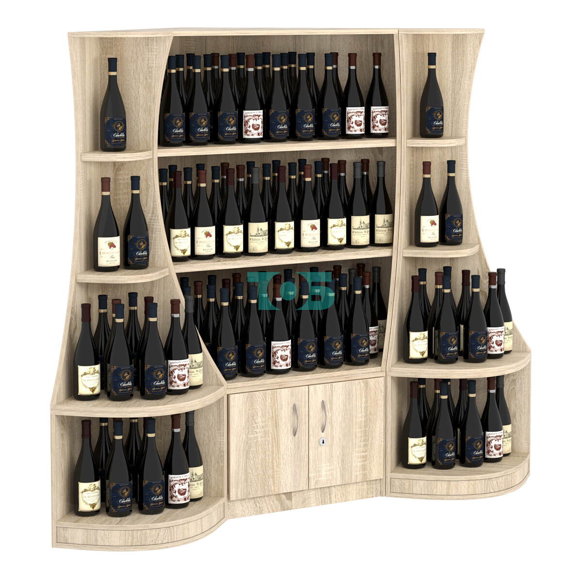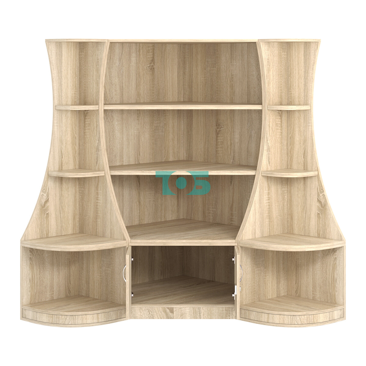 - включает три отдельных модуля - один низкий угловой стеллаж и два стеллажа-сектора серии COSMETIC, образующих внешние углы;