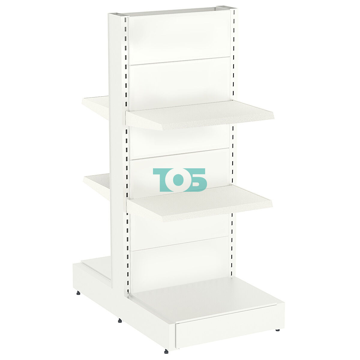 Тип стеллажа: островной. Полки расположены по обеим сторонам, что обеспечивает максимальное использование доступного пространства.