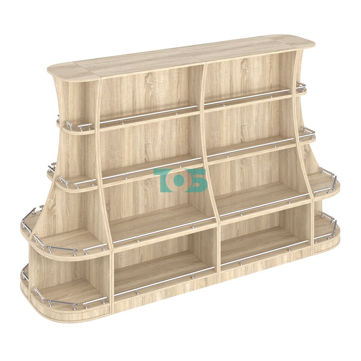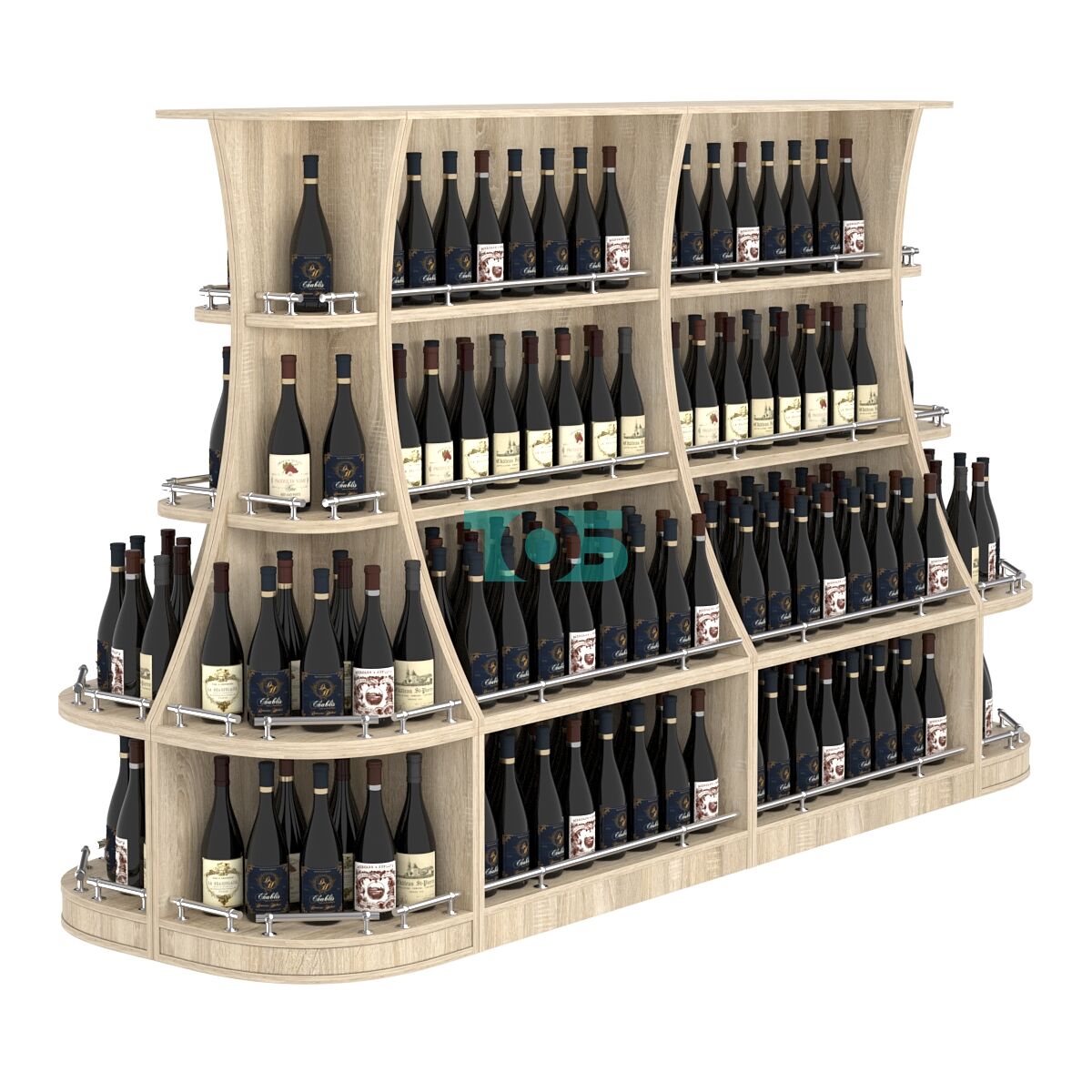 Островной низкий четырех - секционный с закруглениями стеллаж для продажи алкоголя серии ГАРАНТ №2
