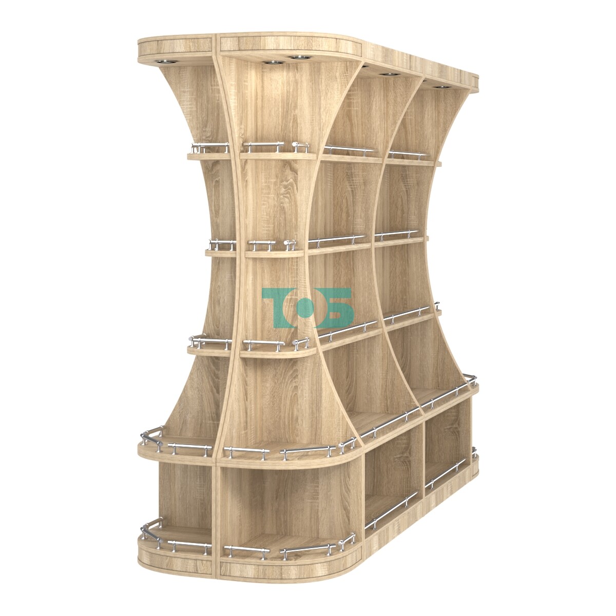 Островной высокий стеллаж секционный с закруглениями и подсветкой для продажи алкоголя серии ГАРАНТ №2