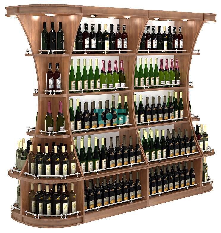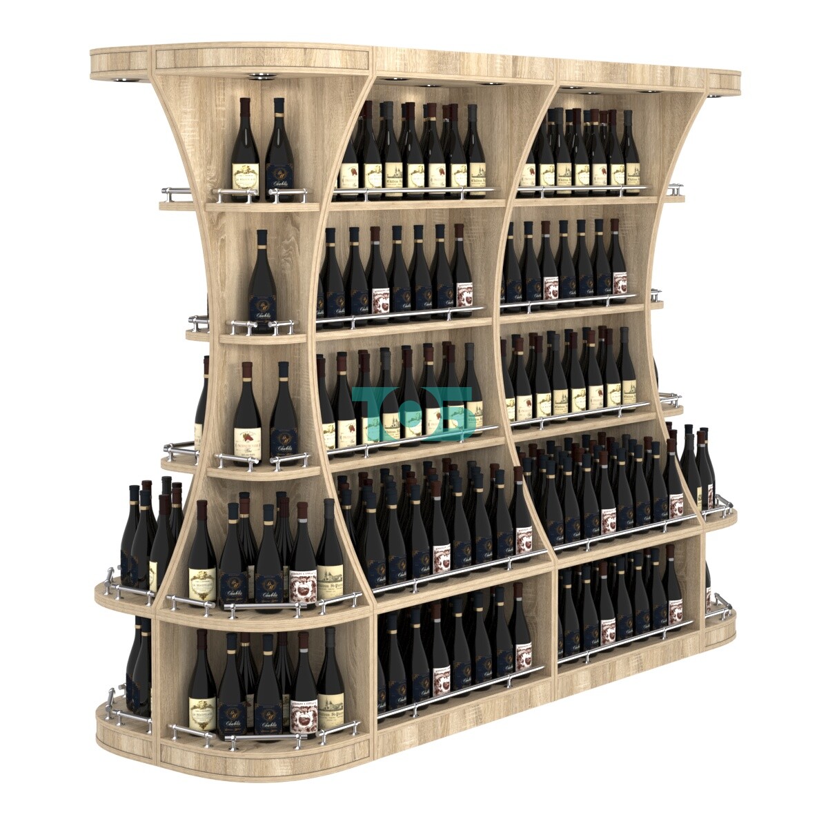Конструкция: стеллаж образует высокий островок в центре торгового зала, эффективно используя пространство и акцентируя внимание на алкогольной продукции.