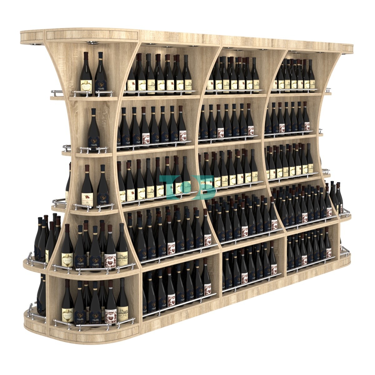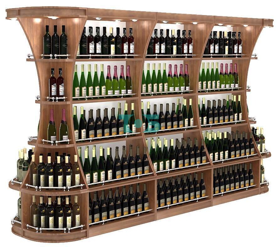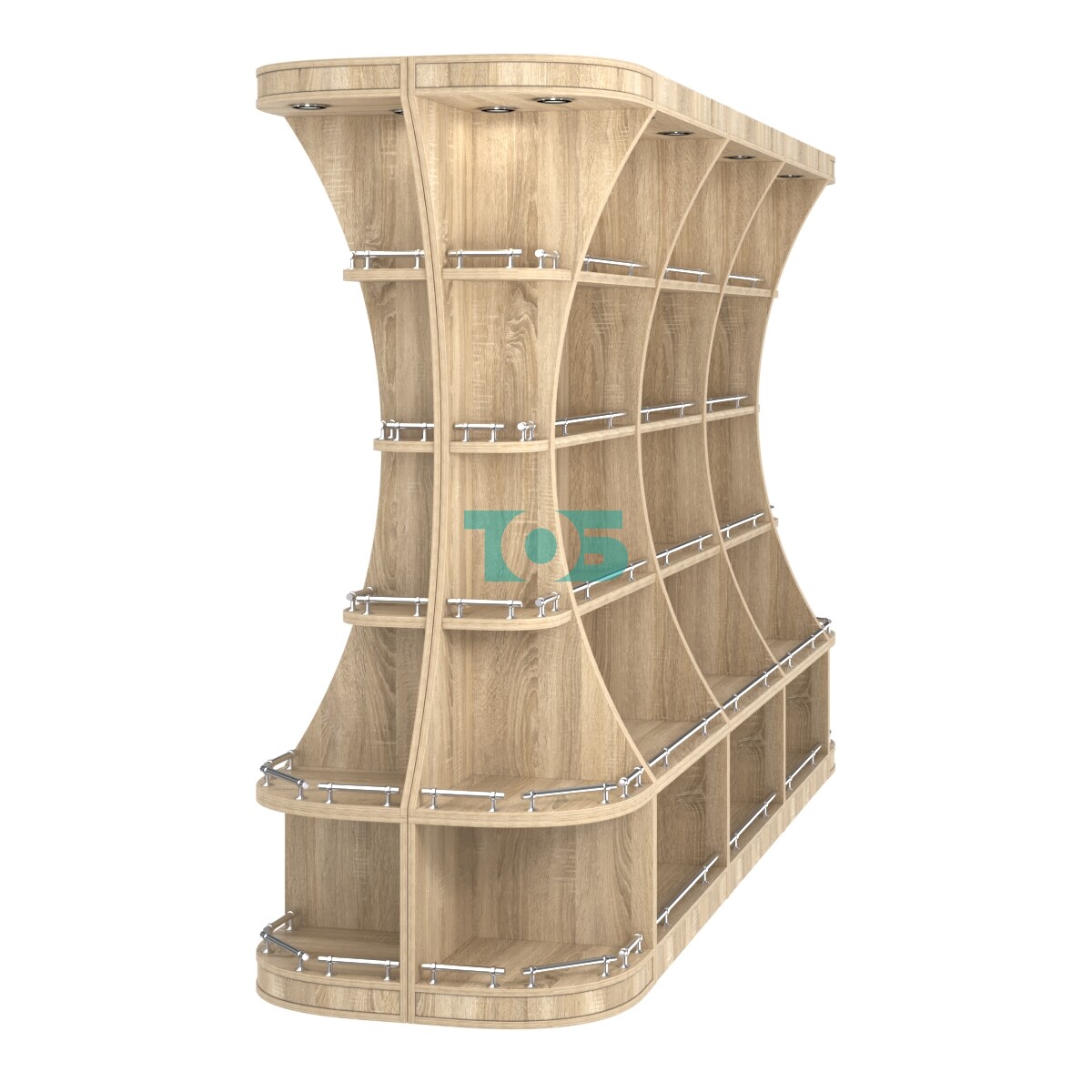 Конструкция: стеллаж образует высокий островок в центре торгового зала, что позволяет эффективно использовать пространство и акцентировать внимание на алкогольной продукции.