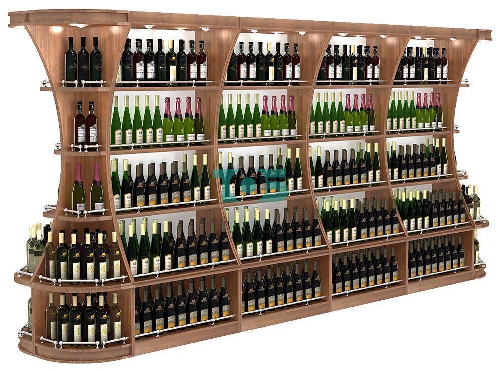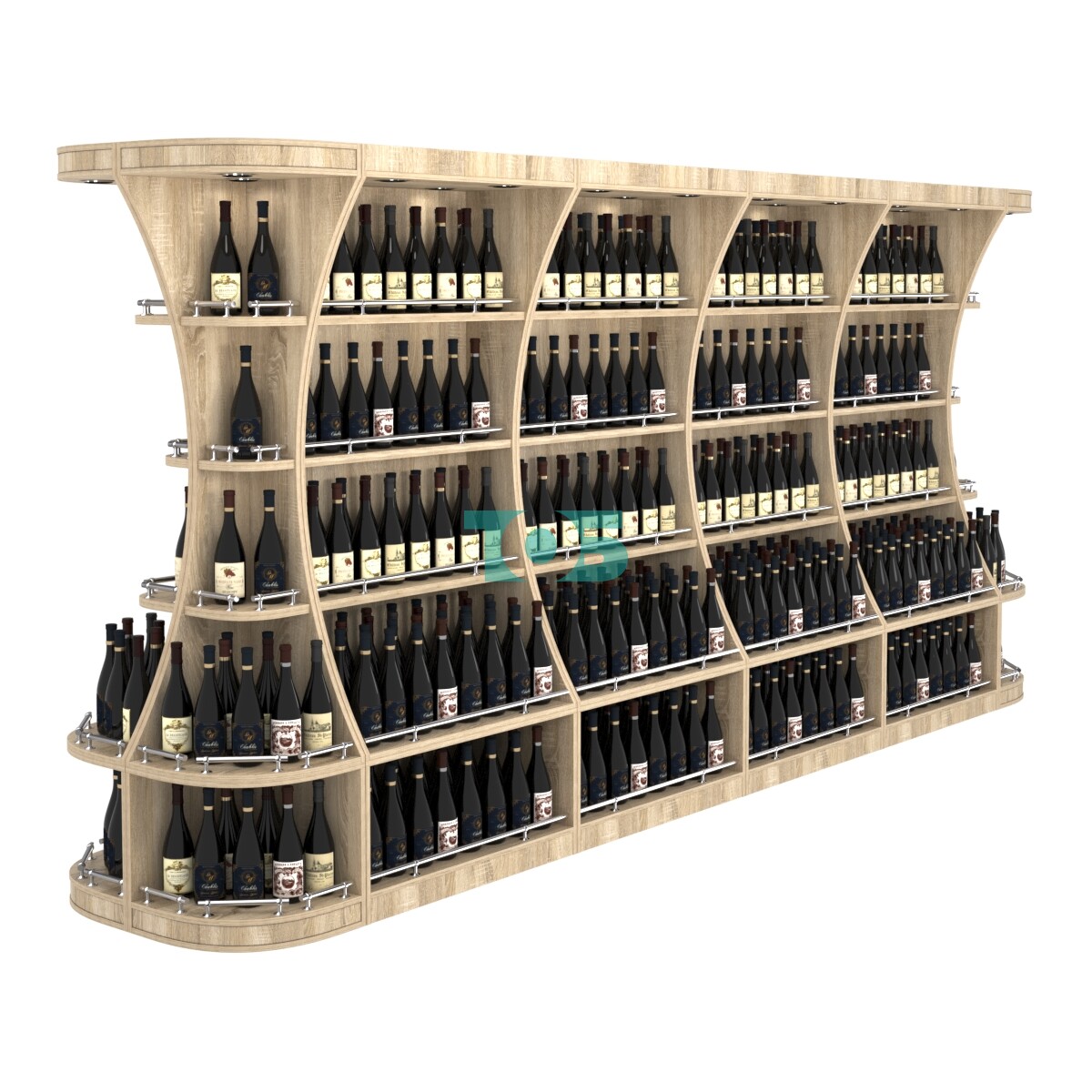 Конструкция: стеллаж образует высокий островок в центре торгового зала, эффективно используя пространство и акцентируя внимание на алкогольной продукции.