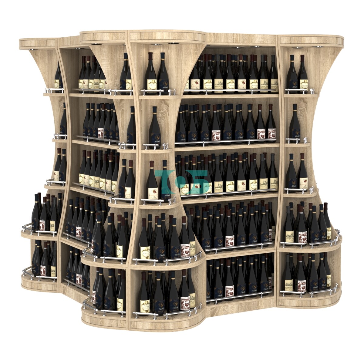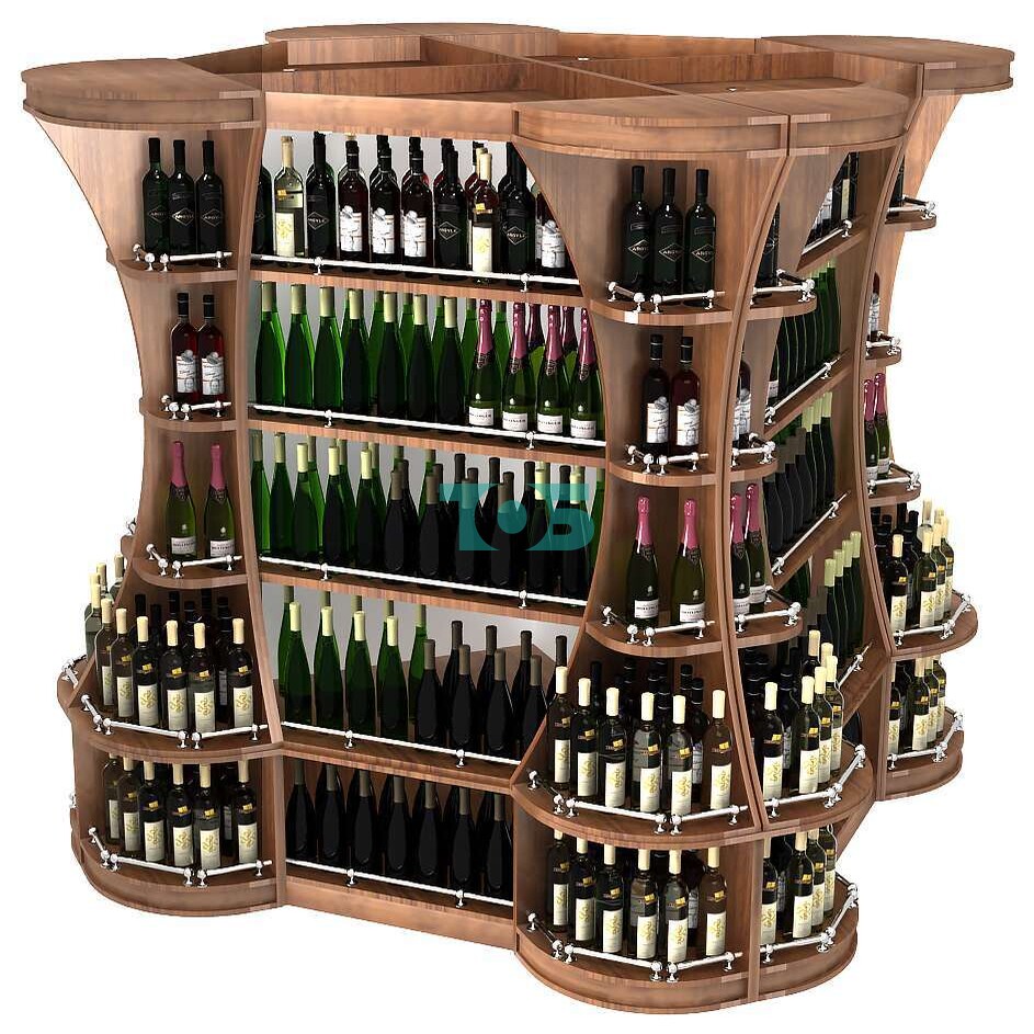Конструкция: стеллаж образует высокий островок в центре торгового зала, что позволяет оптимально использовать пространство и привлечь внимание к алкогольной продукции.