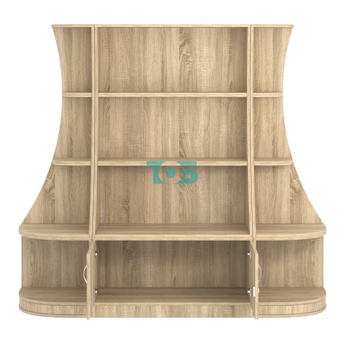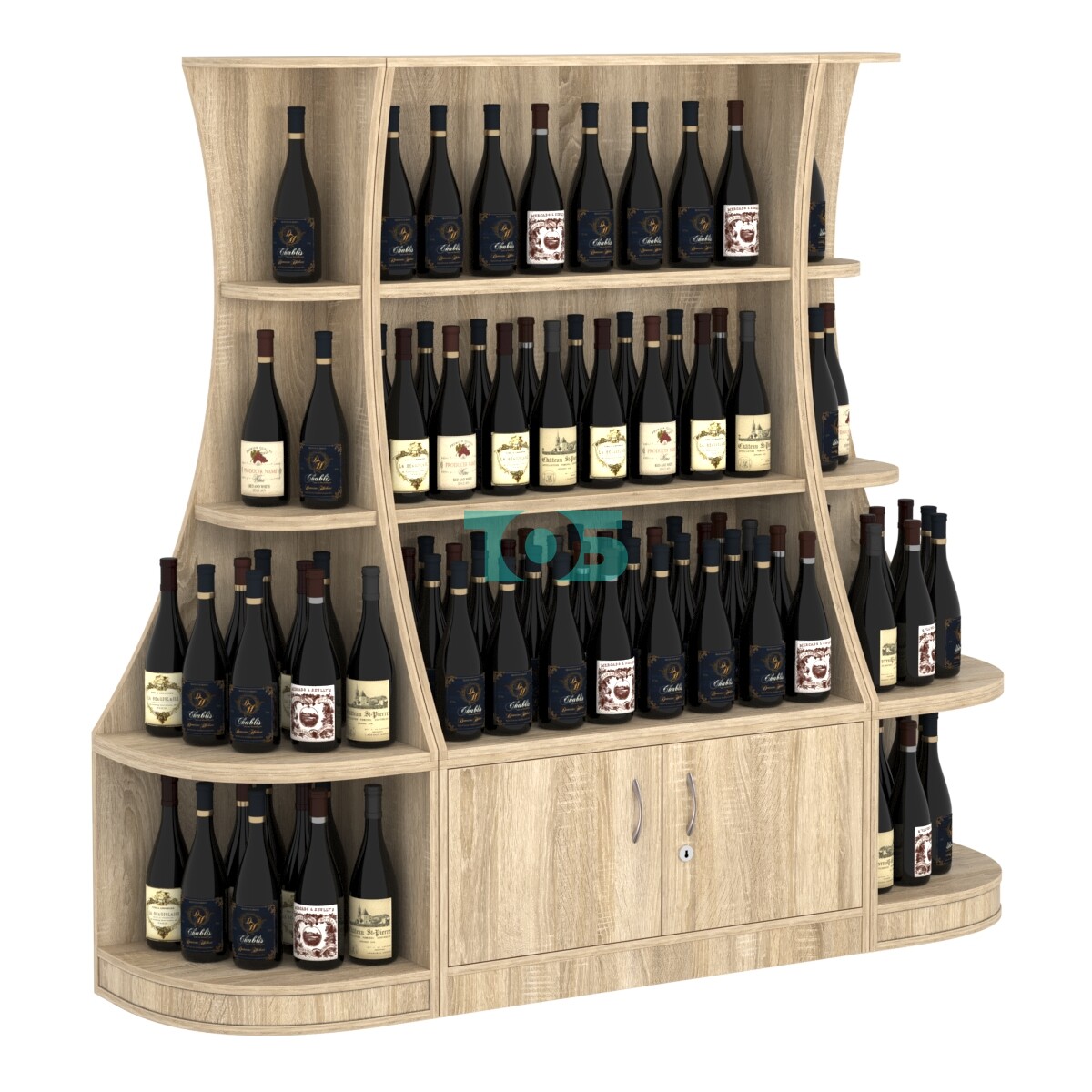 - включает три отдельных модуля - один низкий прямоугольный стеллаж и два стеллажа-сектора серии COSMETIC, образующих внешние углы;