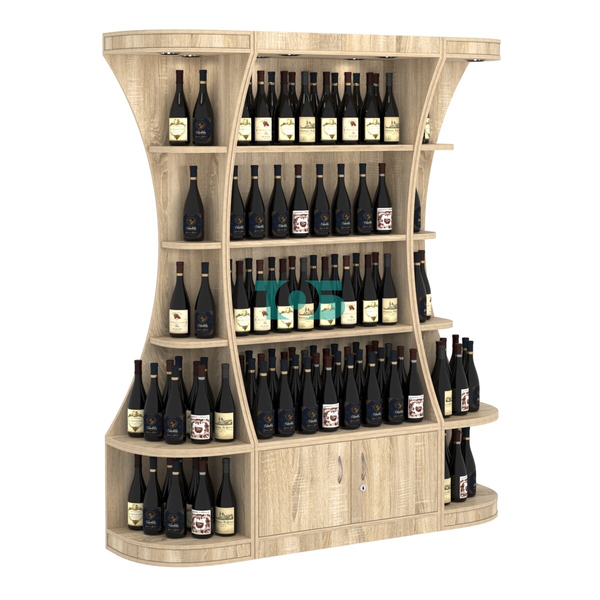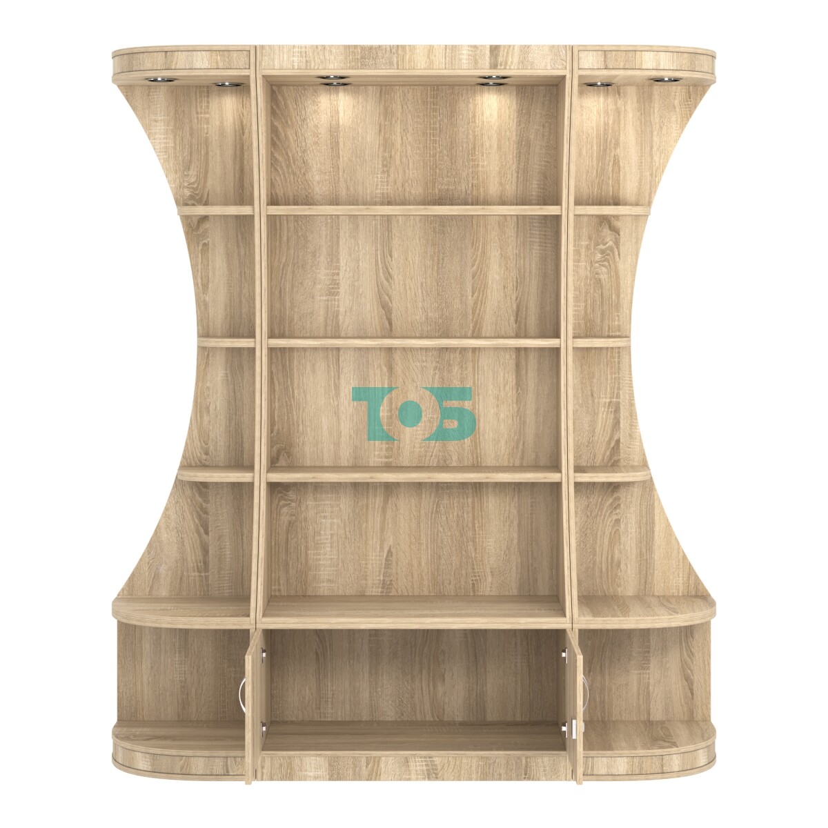 - включает три отдельных модуля - один высокий прямоугольный стеллаж и два стеллажа-сектора с подсветкой серии COSMETIC, образующих внешние углы;