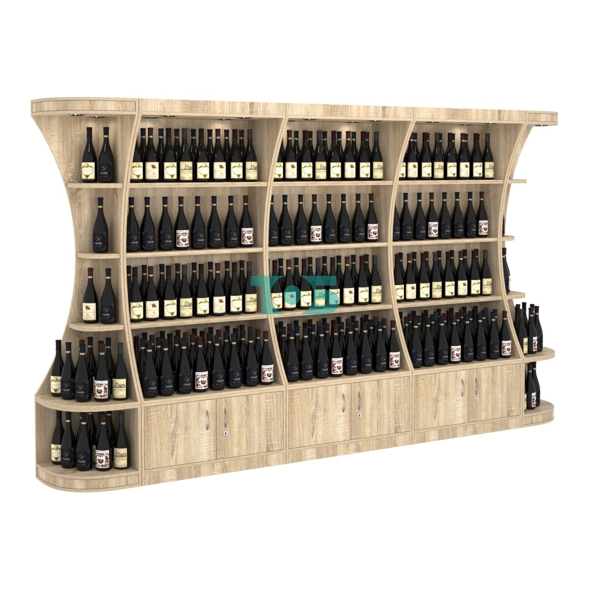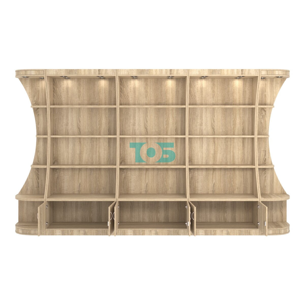 - включает пять отдельных модулей - три высоких прямоугольных стеллажа и два стеллажа-сектора с подсветкой серии COSMETIC, образующих внешние углы;
