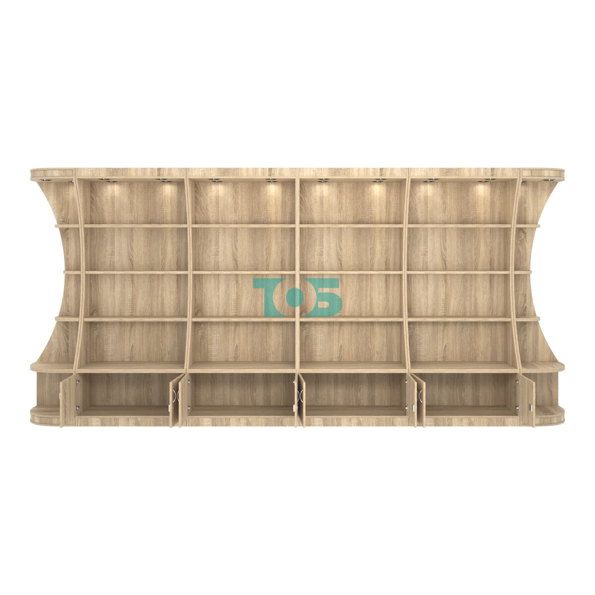 - включает шесть отдельных модулей - четыре высоких прямоугольных стеллажа и два стеллажа-сектора с подсветкой серии COSMETIC, образующих внешние углы;