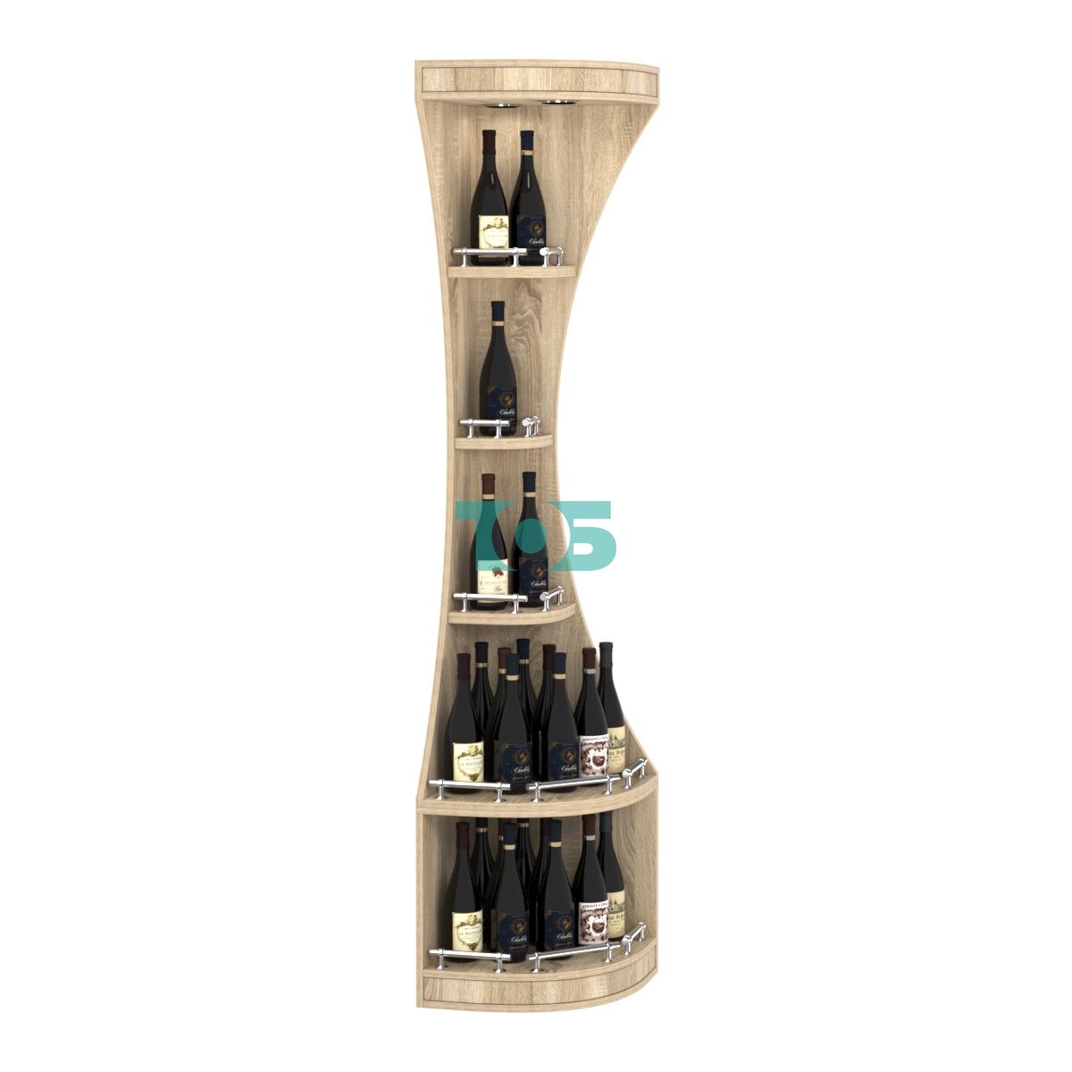 Полки: прямые, толщиной 25 мм, с пластиковой кромкой для защиты края. На каждой полке установлены хромированные ограничители, предотвращающие падение бутылок.