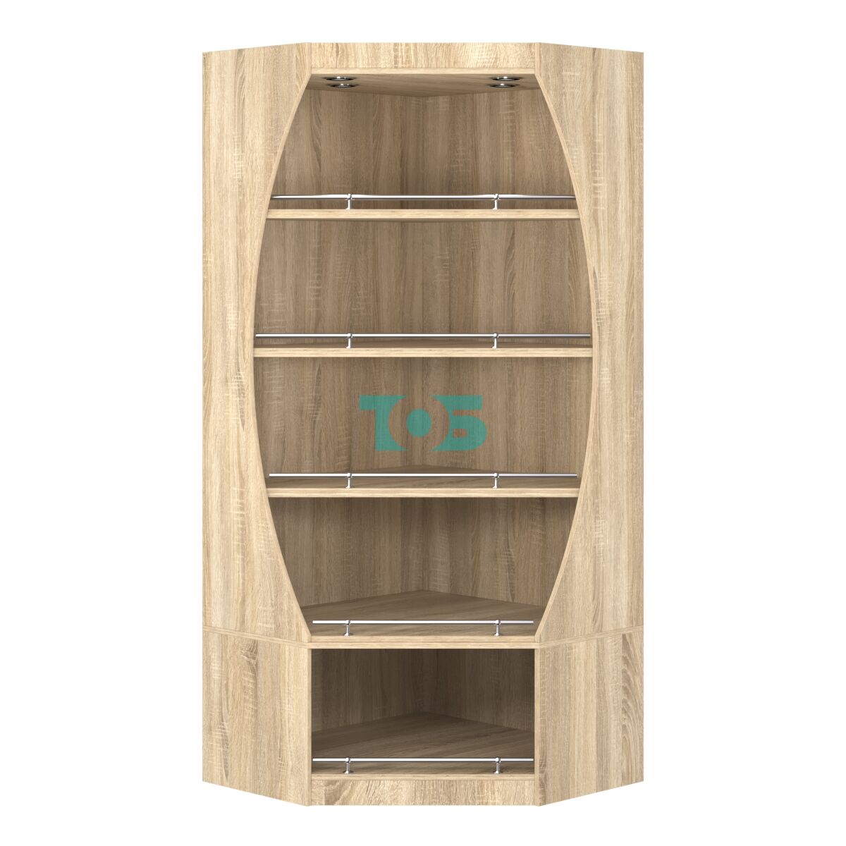 Полки: прямые, толщиной 25 мм, с пластиковой кромкой для защиты края. На каждой полке установлены хромированные ограничители, предотвращающие падение бутылок.
