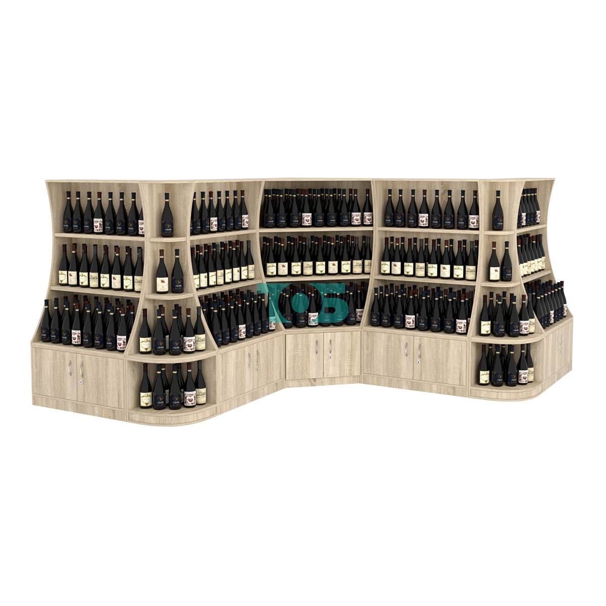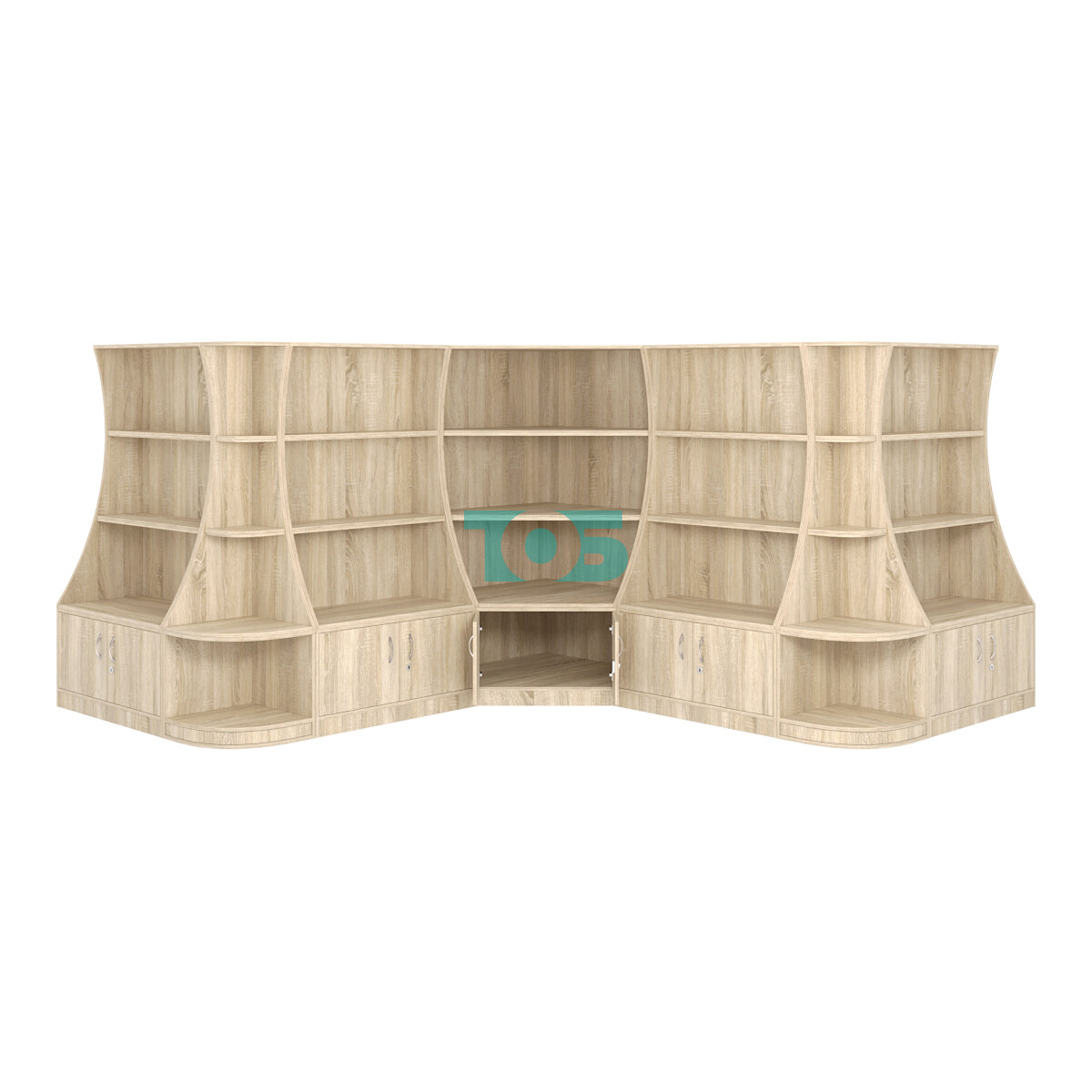 - включает семь отдельных модулей - один низкий угловой стеллаж, четыре низких прямоугольных стеллажа и два стеллажа-сектора серии COSMETIC, образующих внешние углы;