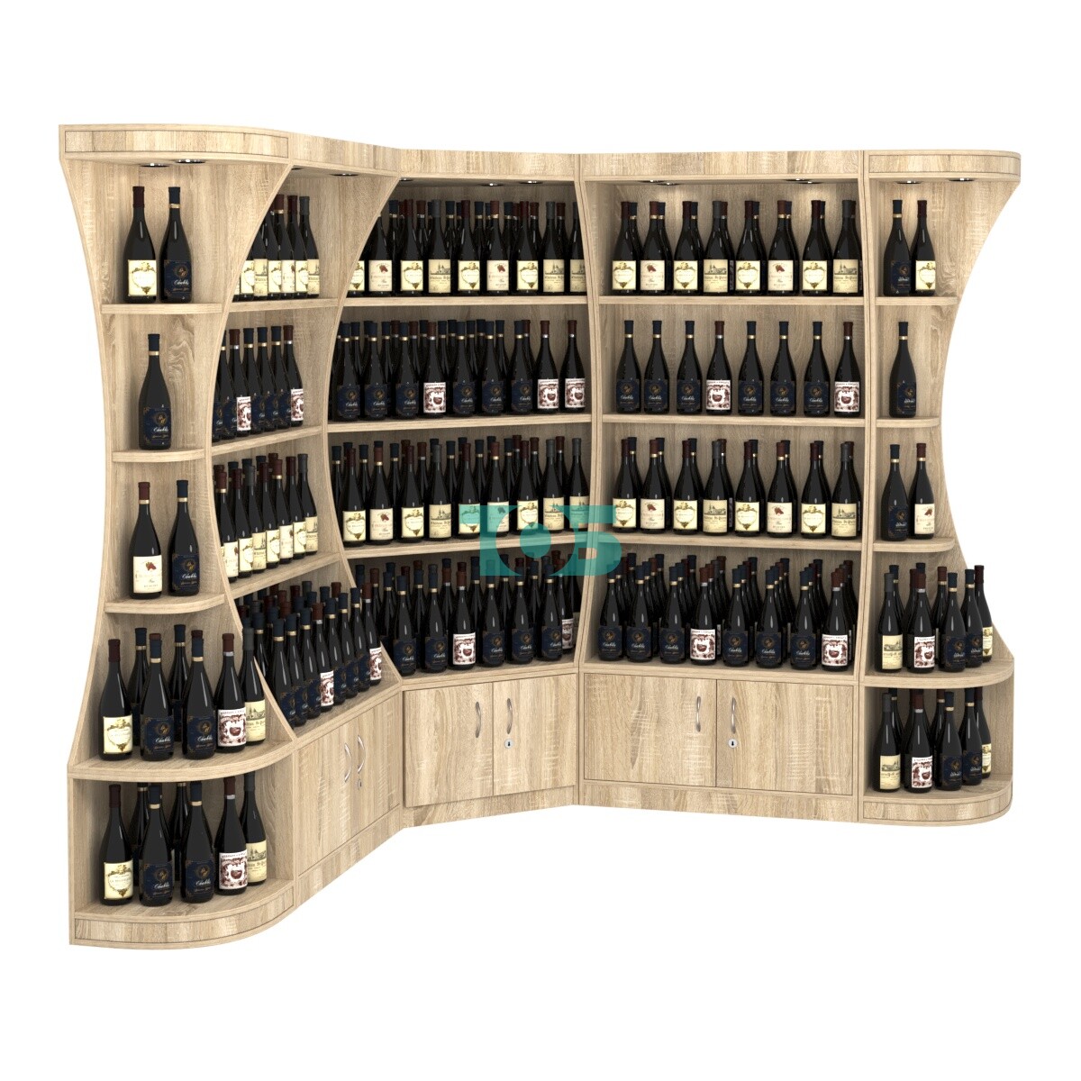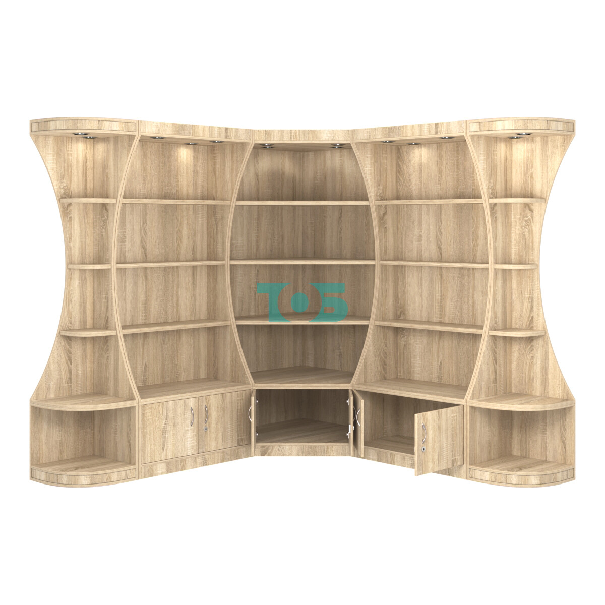 - включает пять отдельных модулей - один высокий угловой стеллаж, два высоких прямоугольных стеллажа и два стеллажа-сектора серии COSMETIC, образующих внешние углы;